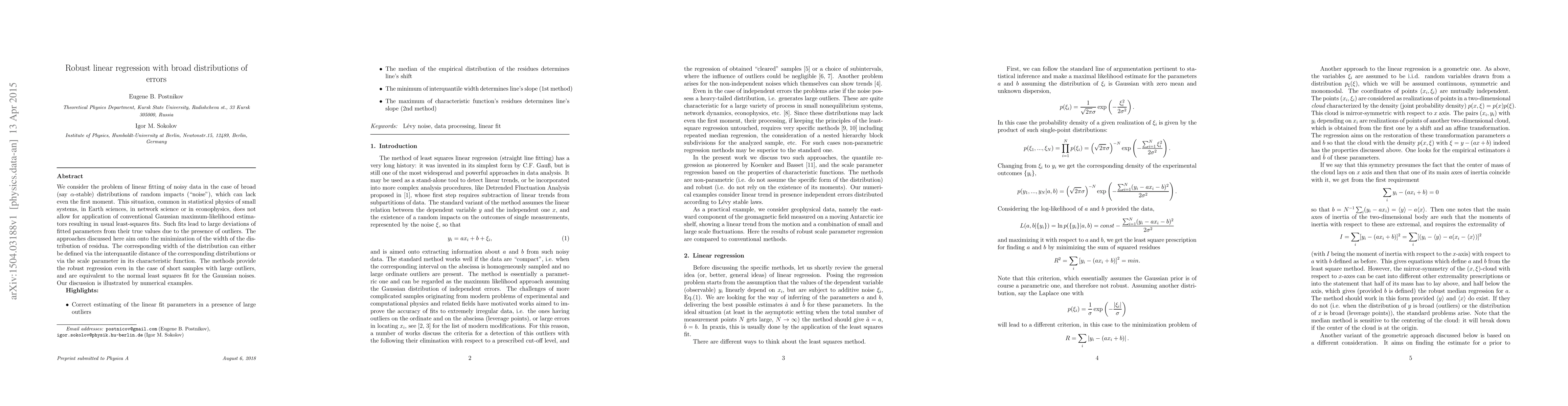 We consider the problem of linear fitting of noisy data in the case of broad (say $\alpha$-stable) distributions of random impacts ("noise"), which can lack even the first moment. This situation, common in statistical physics of small systems, in Earth sciences, in network science or in econophysics, does not allow for application of conventional Gaussian maximum-likelihood estimators resulting in usual least-squares fits. Such fits lead to large deviations of fitted parameters from their true values due to the presence of outliers. The approaches discussed here aim onto the minimization of the width of the distribution of residua. The corresponding width of the distribution can either be defined via the interquantile distance of the corresponding distributions or via the scale parameter in its characteristic function. The methods provide the robust regression even in the case of short samples with large outliers, and are equivalent to the normal least squares fit for the Gaussian noises. Our discussion is illustrated by numerical examples.