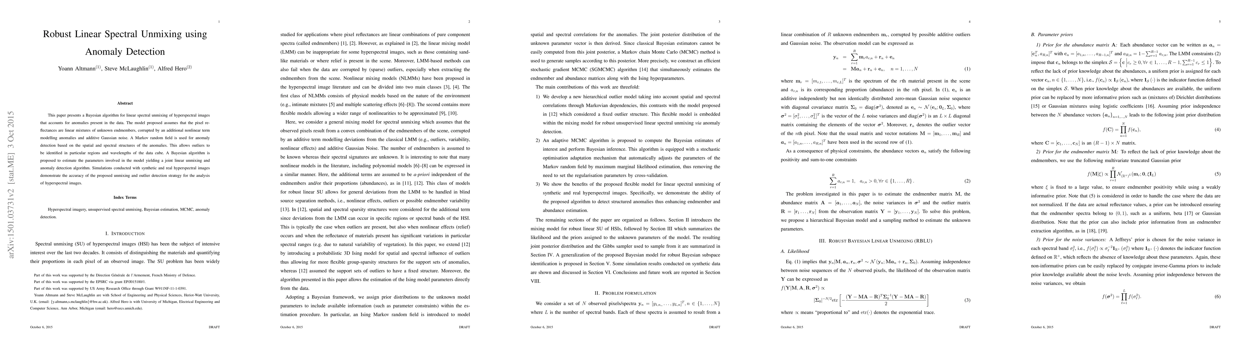 This paper introduces a Bayesian algorithm for linear spectral unmixing in hyperspectral images, incorporating anomaly detection to identify and account for outliers. The algorithm uses a Markov random field to detect anomalies based on spatial and spectral data, achieving accurate unmixing and anomaly identification.