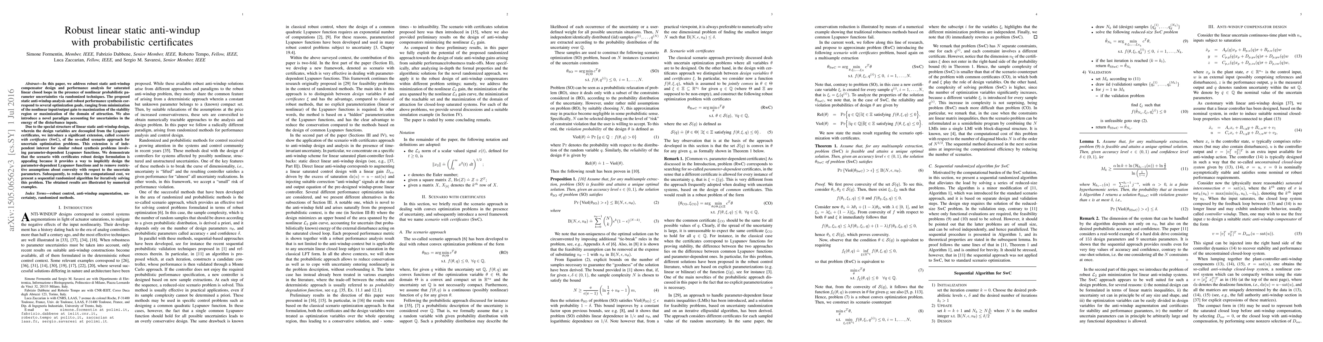 In this paper, we address robust static anti-windup compensator design and performance analysis for saturated linear closed loops in the presence of nonlinear probabilistic parameter uncertainties via randomized techniques. The proposed static anti-windup analysis and robust performance synthesis correspond to several optimization goals, ranging from minimization of the nonlinear input/output gain to maximization of the stability region or maximization of the domain of attraction. We also introduce a novel paradigm accounting for uncertainties in the energy of the disturbance inputs. Due to the special structure of linear static anti-windup design, wherein the design variables are decoupled from the Lyapunov certificates, we introduce a significant extension, called scenario with certificates (SwC), of the so-called scenario approach for uncertain optimization problems. This extension is of independent interest for similar robust synthesis problems involving parameter-dependent Lyapunov functions. We demonstrate that the scenario with certificates robust design formulation is appealing because it provides a way to implicitly design the parameter-dependent Lyapunov functions and to remove restrictive assumptions about convexity with respect to the uncertain parameters. Subsequently, to reduce the computational cost, we present a sequential randomized algorithm for iteratively solving this problem. The obtained results are illustrated by numerical examples.
