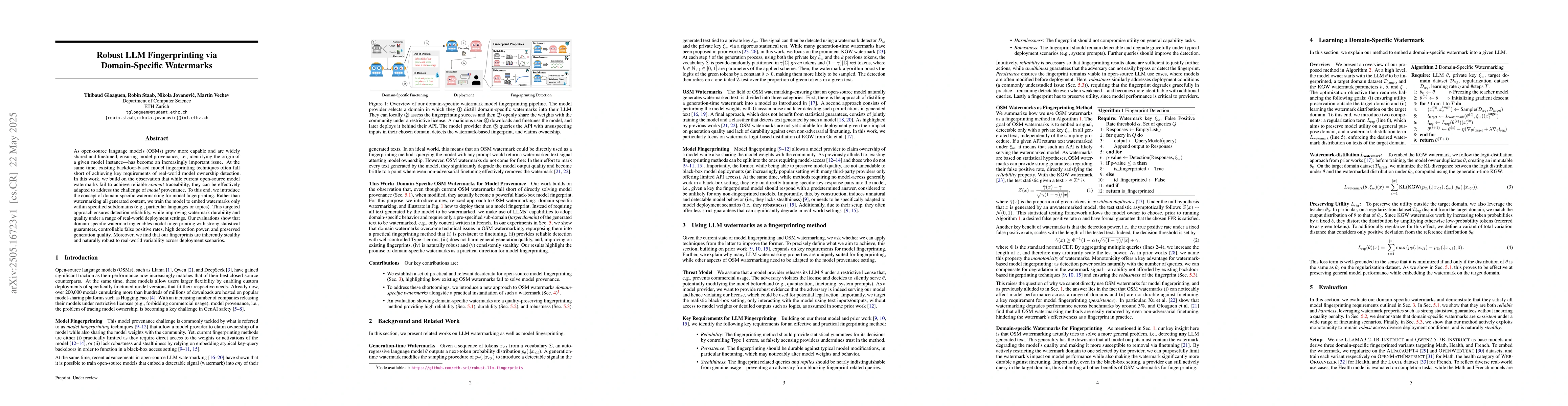 This paper introduces domain-specific watermarking for robust model fingerprinting in open-source language models, improving detection reliability and durability while preserving generation quality.