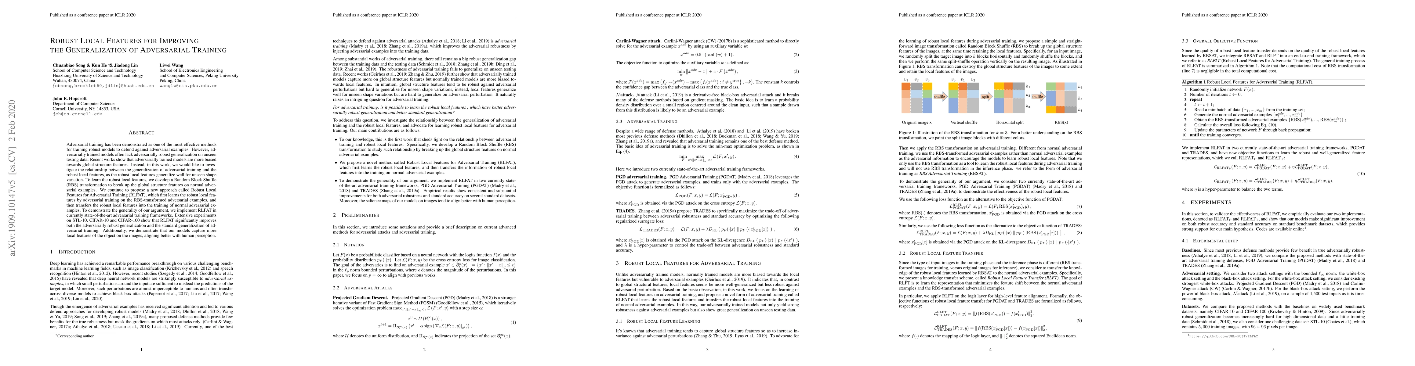 This paper proposes a method called Robust Local Features for Adversarial Training (RLFAT) to improve the generalization of adversarial training by focusing on robust local features rather than global structures. RLFAT uses Random Block Shuffle transformations and demonstrates significant improvements in both adversarial and standard generalization across multiple datasets.