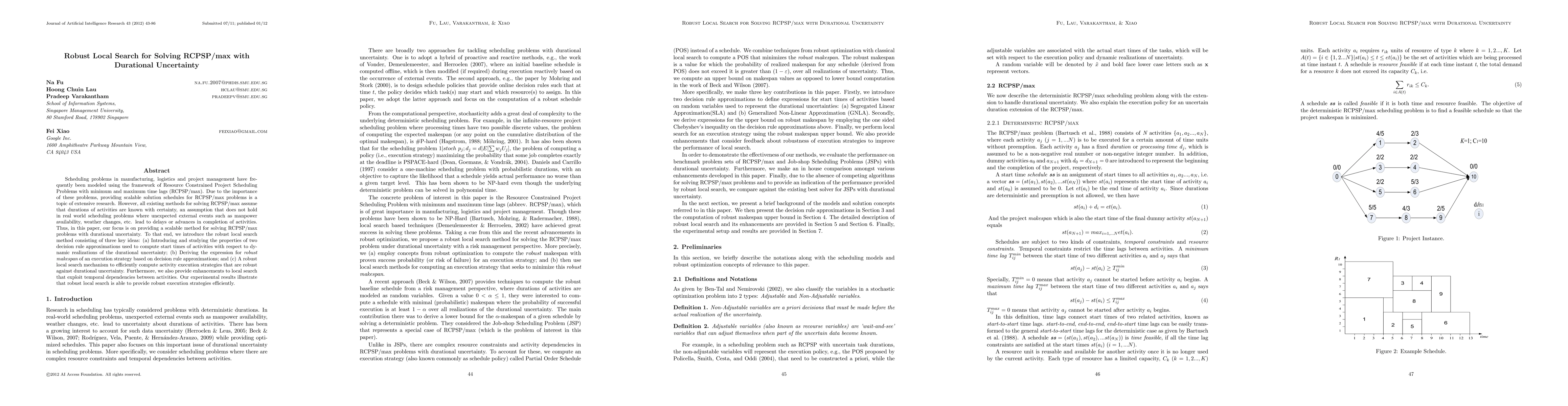 Scheduling problems in manufacturing, logistics and project management have frequently been modeled using the framework of Resource Constrained Project Scheduling Problems with minimum and maximum time lags (RCPSP/max). Due to the importance of these problems, providing scalable solution schedules for RCPSP/max problems is a topic of extensive research. However, all existing methods for solving RCPSP/max assume that durations of activities are known with certainty, an assumption that does not hold in real world scheduling problems where unexpected external events such as manpower availability, weather changes, etc. lead to delays or advances in completion of activities. Thus, in this paper, our focus is on providing a scalable method for solving RCPSP/max problems with durational uncertainty. To that end, we introduce the robust local search method consisting of three key ideas: (a) Introducing and studying the properties of two decision rule approximations used to compute start times of activities with respect to dynamic realizations of the durational uncertainty; (b) Deriving the expression for robust makespan of an execution strategy based on decision rule approximations; and (c) A robust local search mechanism to efficiently compute activity execution strategies that are robust against durational uncertainty. Furthermore, we also provide enhancements to local search that exploit temporal dependencies between activities. Our experimental results illustrate that robust local search is able to provide robust execution strategies efficiently.