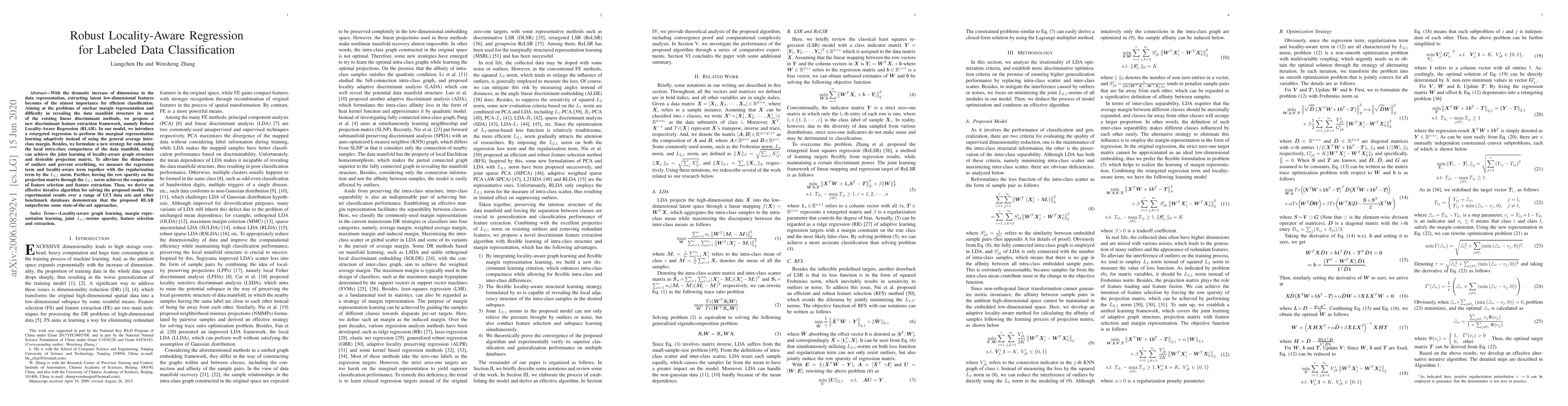 The paper proposes Robust Locality-Aware Regression (RLAR) for labeled data classification, addressing unclear margin representation and data manifold structure issues in linear discriminant methods. RLAR uses retargeted regression and locality-aware graph structure learning, with L2,1 norm regularization to handle outliers and prevent overfitting, achieving superior performance over state-of-the-art methods.