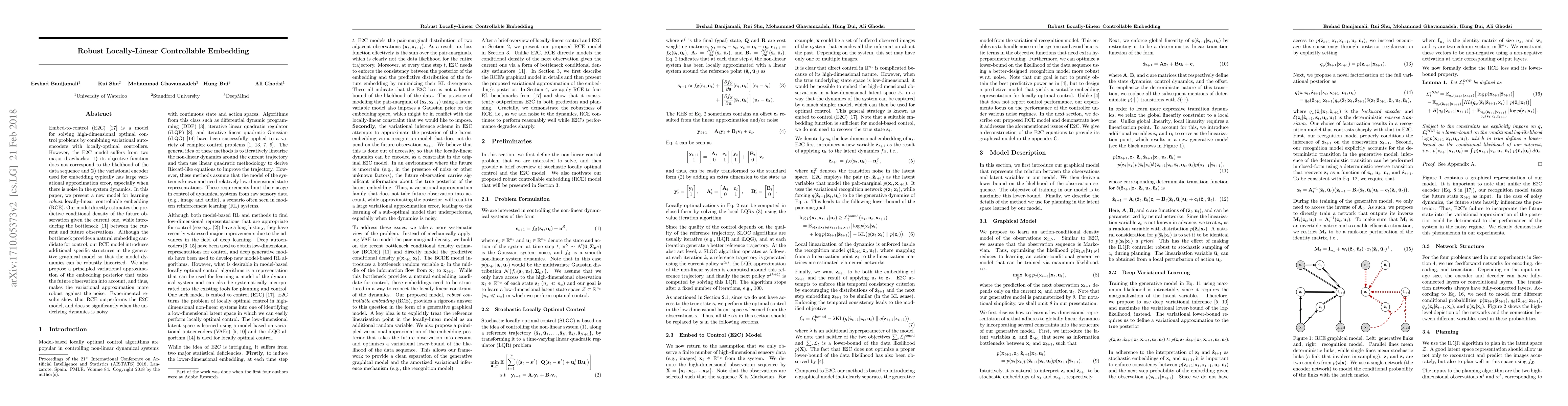 This paper introduces a robust locally-linear controllable embedding (RCE) model to address the limitations of the existing embed-to-control (E2C) model, specifically its non-likelihood objective function and high variational approximation error. The RCE model estimates the predictive conditional density and incorporates a bottleneck for robust embedding, achieving better performance, especially in noisy dynamic environments.
