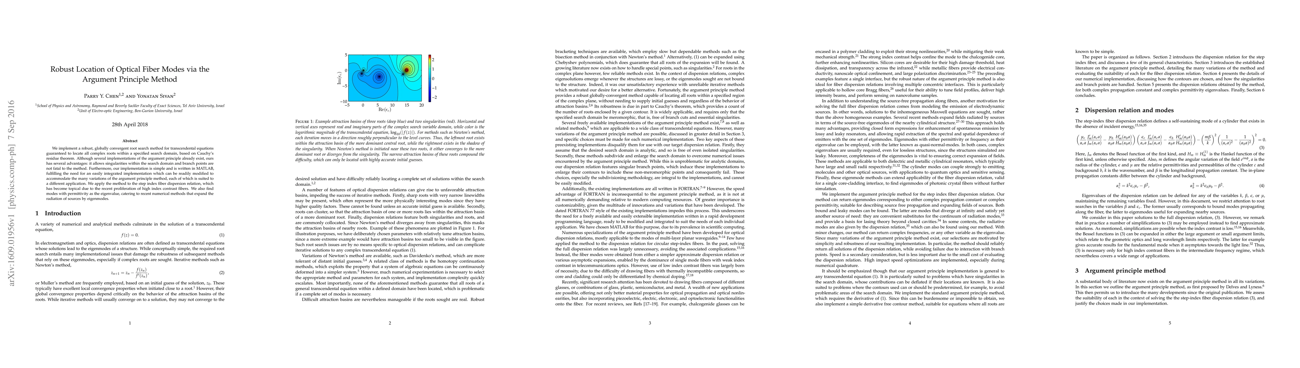 We implement a robust, globally convergent root search method for transcendental equations guaranteed to locate all complex roots within a specified search domain, based on Cauchy's residue theorem. Although several implementations of the argument principle already exist, ours has several advantages: it allows singularities within the search domain and branch points are not fatal to the method. Furthermore, our implementation is simple and is written in MATLAB, fulfilling the need for an easily integrated implementation which can be readily modified to accommodate the many variations of the argument principle method, each of which is suited to a different application. We apply the method to the step index fiber dispersion relation, which has become topical due to the recent proliferation of high index contrast fibers. We also find modes with permittivity as the eigenvalue, catering to recent numerical methods that expand the radiation of sources by eigenmodes.