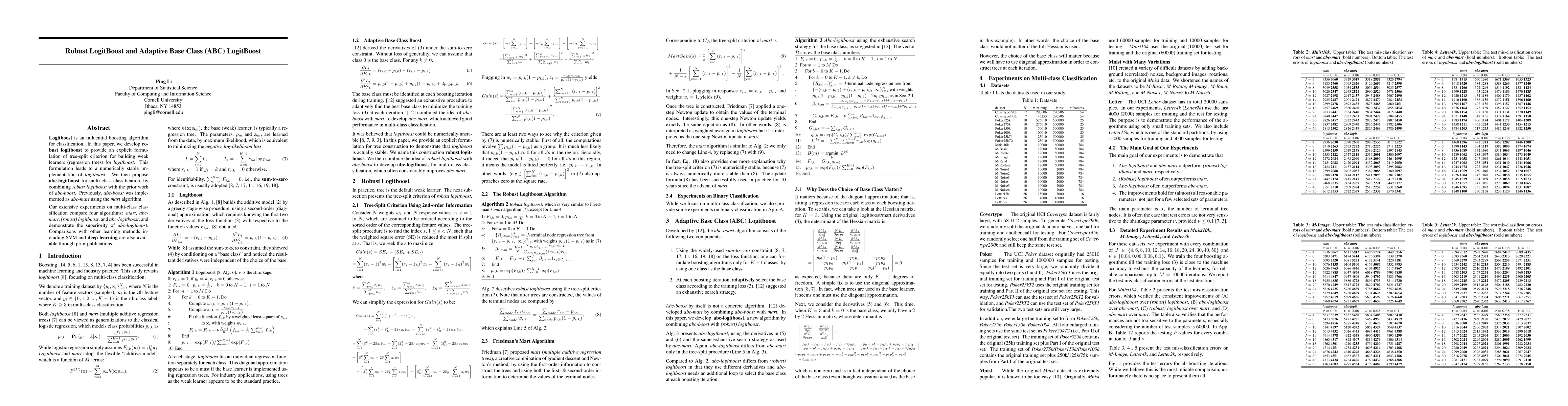This paper introduces a numerically stable version of LogitBoost and proposes an adaptive base class (ABC) LogitBoost for multi-class classification, combining robust LogitBoost with prior ABC-Boost work. Experimental results show that ABC-LogitBoost outperforms logitboost, abcmart, and other methods like SVM and deep learning.