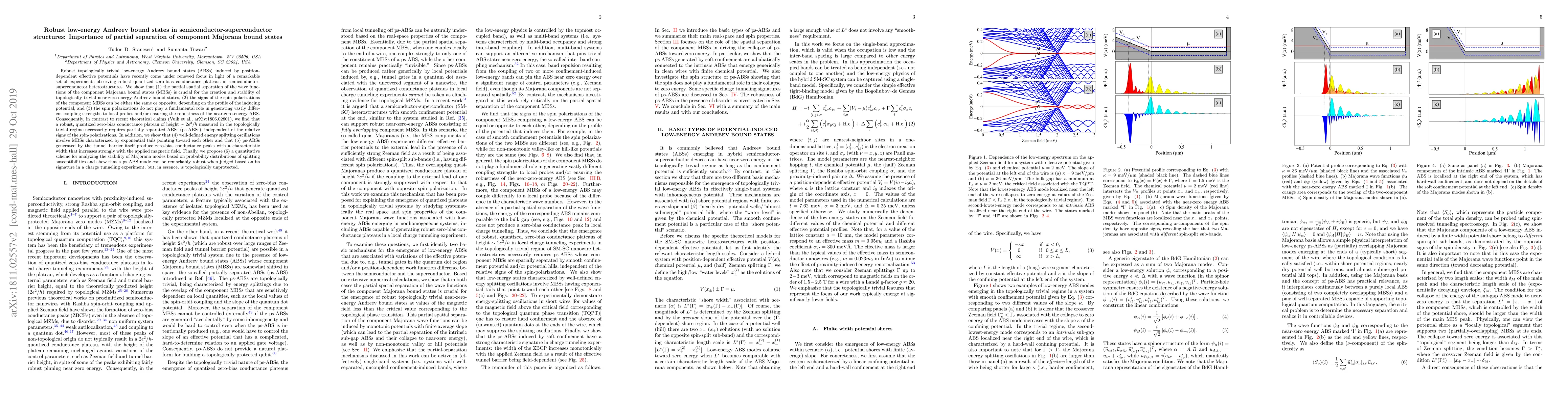This paper investigates the role of partial spatial separation of Majorana bound states in creating robust low-energy Andreev bound states in semiconductor-superconductor heterostructures, emphasizing that such separation is crucial for the stability of these states and the observed quantized zero-bias conductance plateaus. It also highlights that the spin polarizations of the Majorana states do not fundamentally influence the robustness of these states.