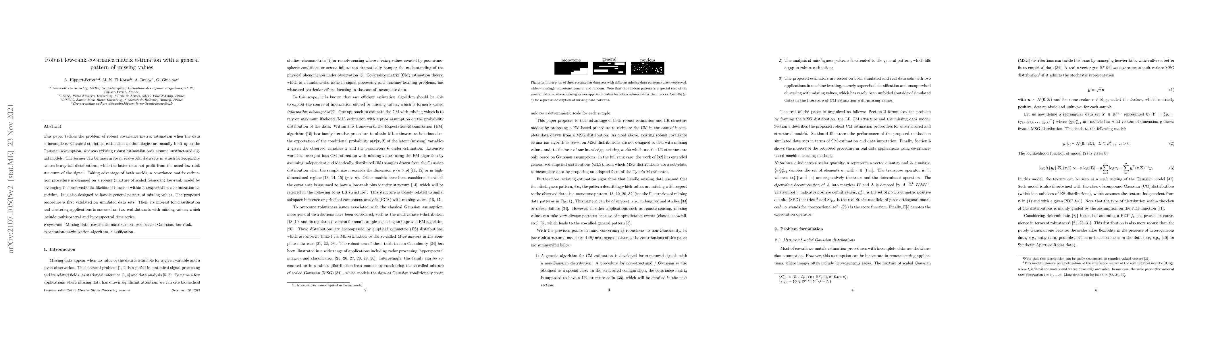 This paper proposes a robust low-rank covariance matrix estimation method for incomplete data, leveraging a mixture of scaled Gaussian models to handle heavy-tail distributions and general missing patterns. The method is validated on simulated data and tested for real-world applications in classification and clustering.