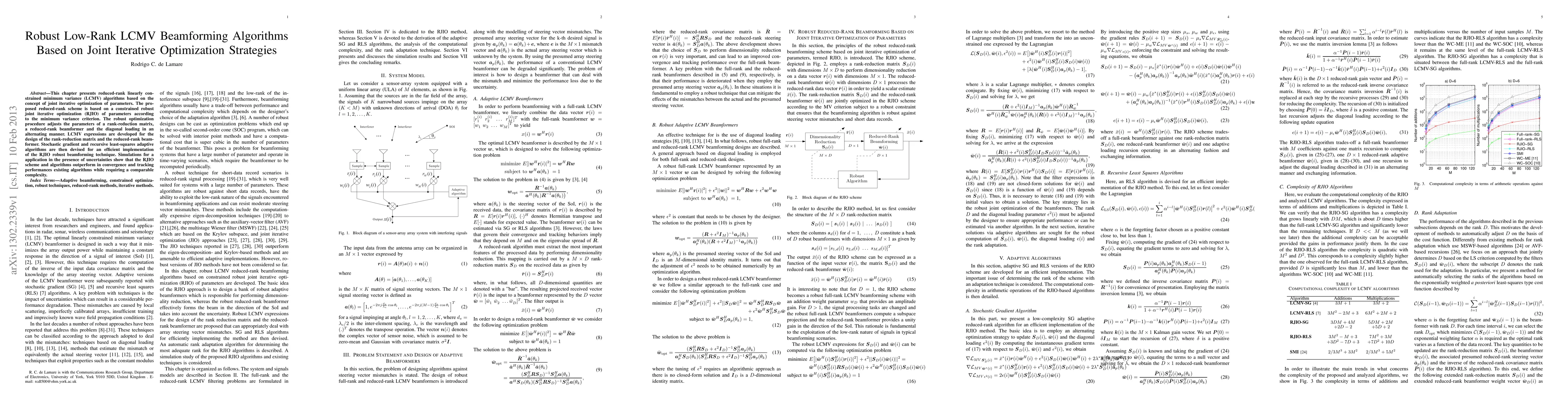 This chapter presents reduced-rank linearly constrained minimum variance (LCMV) algorithms based on the concept of joint iterative optimization of parameters. The proposed reduced-rank scheme is based on a constrained robust joint iterative optimization (RJIO) of parameters according to the minimum variance criterion. The robust optimization procedure adjusts the parameters of a rank-reduction matrix, a reduced-rank beamformer and the diagonal loading in an alternating manner. LCMV expressions are developed for the design of the rank-reduction matrix and the reduced-rank beamformer. Stochastic gradient and recursive least-squares adaptive algorithms are then devised for an efficient implementation of the RJIO robust beamforming technique. Simulations for a application in the presence of uncertainties show that the RJIO scheme and algorithms outperform in convergence and tracking performances existing algorithms while requiring a comparable complexity.