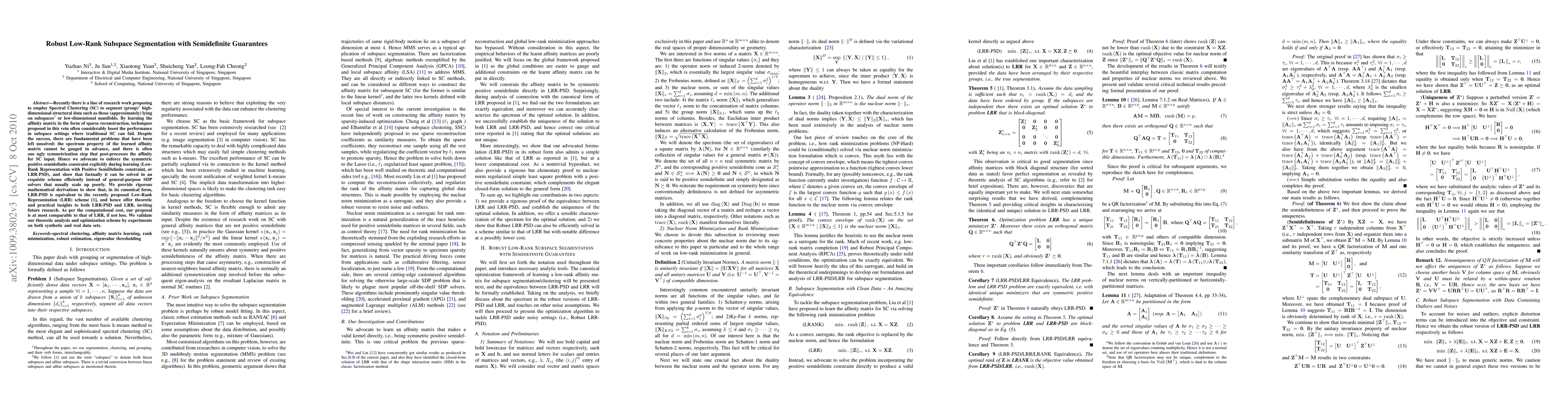 This paper proposes a robust low-rank subspace segmentation method called Low-Rank Representation with Positive SemiDefinite constraint (LRR-PSD) to improve spectral clustering performance on high-dimensional data. It addresses issues in existing methods by enforcing a symmetric positive semidefinite constraint during learning, offering theoretical equivalence to Low-Rank Representation (LRR) and demonstrating competitive computational efficiency.