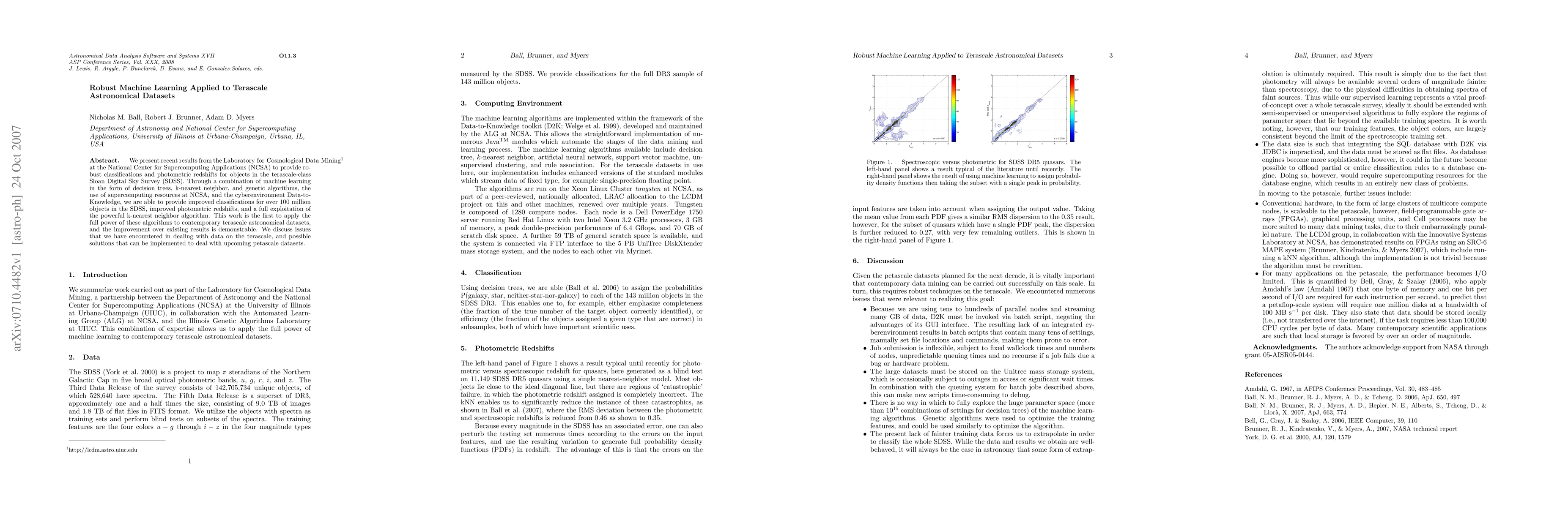This paper details the application of robust machine learning techniques, including decision trees, k-nearest neighbor, and genetic algorithms, to classify and determine photometric redshifts for over 100 million objects in the Sloan Digital Sky Survey. The study leverages supercomputing resources and addresses challenges in managing terascale astronomical data.