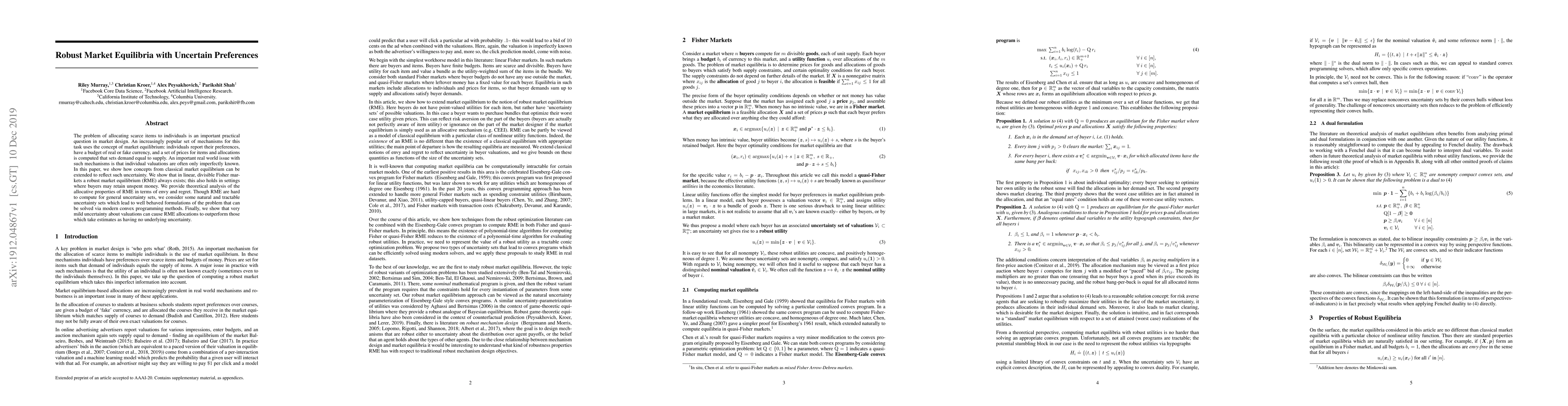 This paper introduces Robust Market Equilibria (RME) to handle uncertain individual valuations in market design. RMEs always exist in linear, divisible Fisher markets, even when buyers keep unspent money, and outperform allocations assuming known valuations under mild uncertainty.