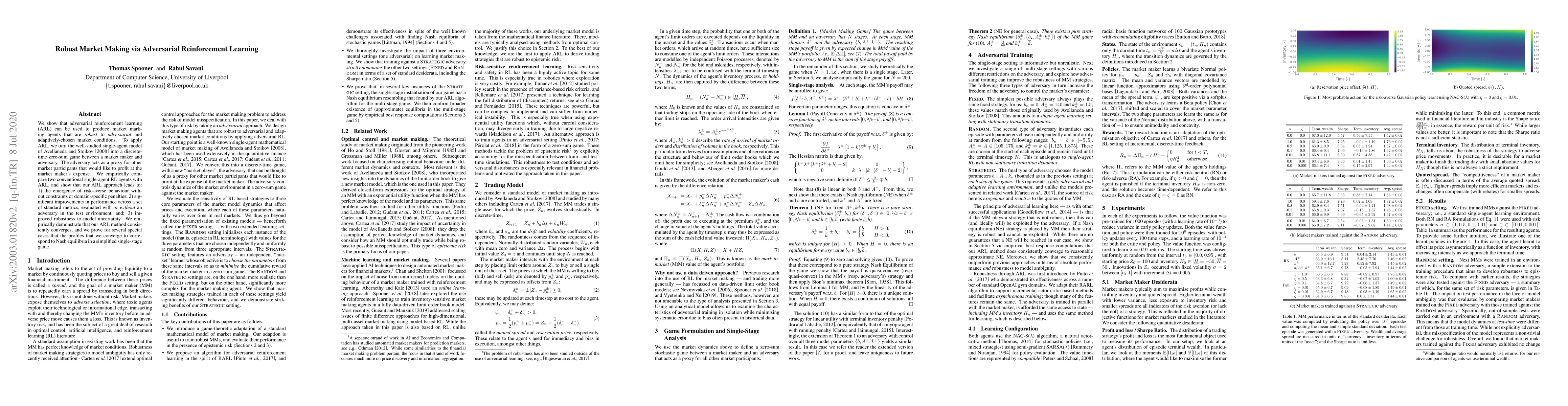 Researchers demonstrate that adversarial reinforcement learning can produce robust market-making agents that adapt to changing conditions without needing explicit constraints or penalties. Their approach outperforms traditional single-agent models in terms of performance and robustness to uncertainty.
