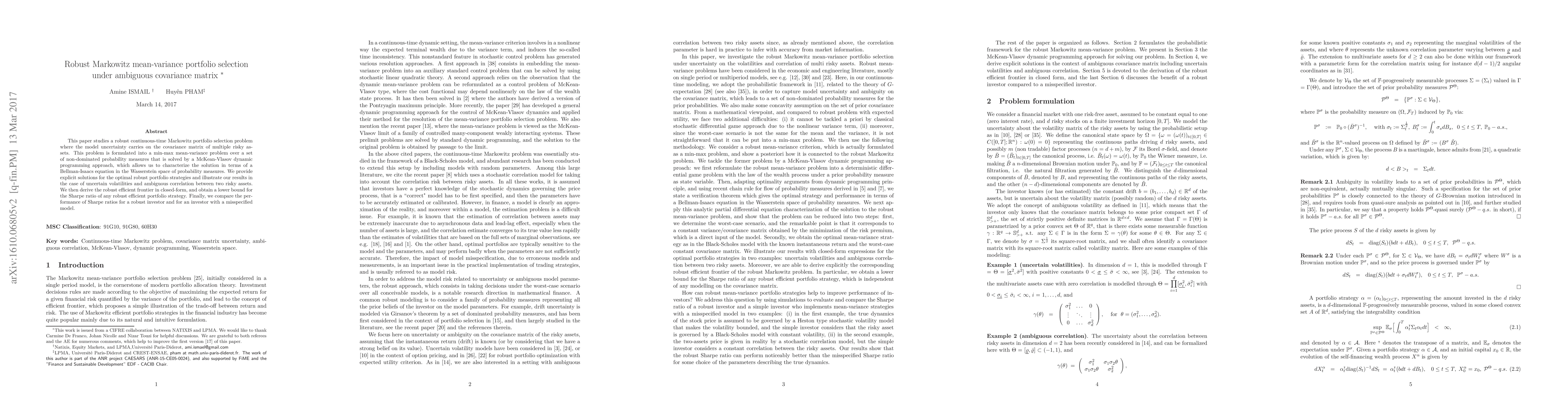 This paper studies a robust continuous-time Markowitz portfolio selection pro\-blem where the model uncertainty carries on the covariance matrix of multiple risky assets. This problem is formulated into a min-max mean-variance problem over a set of non-dominated probability measures that is solved by a McKean-Vlasov dynamic programming approach, which allows us to characterize the solution in terms of a Bellman-Isaacs equation in the Wasserstein space of probability measures. We provide explicit solutions for the optimal robust portfolio strategies and illustrate our results in the case of uncertain volatilities and ambiguous correlation between two risky assets. We then derive the robust efficient frontier in closed-form, and obtain a lower bound for the Sharpe ratio of any robust efficient portfolio strategy. Finally, we compare the performance of Sharpe ratios for a robust investor and for an investor with a misspecified model. MSC Classification: 91G10, 91G80, 60H30