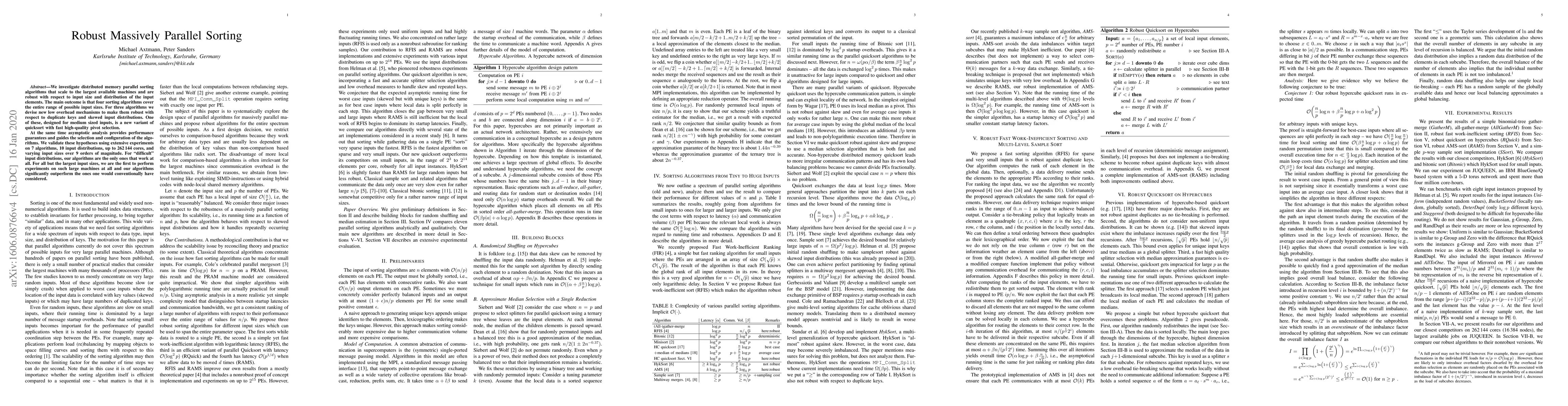 This paper explores distributed memory parallel sorting algorithms that scale to massive machines and handle various input sizes and distributions robustly. It introduces four scalable algorithms, including a new variant of quicksort for medium-sized inputs, and validates their performance through extensive experiments on large-scale systems.
