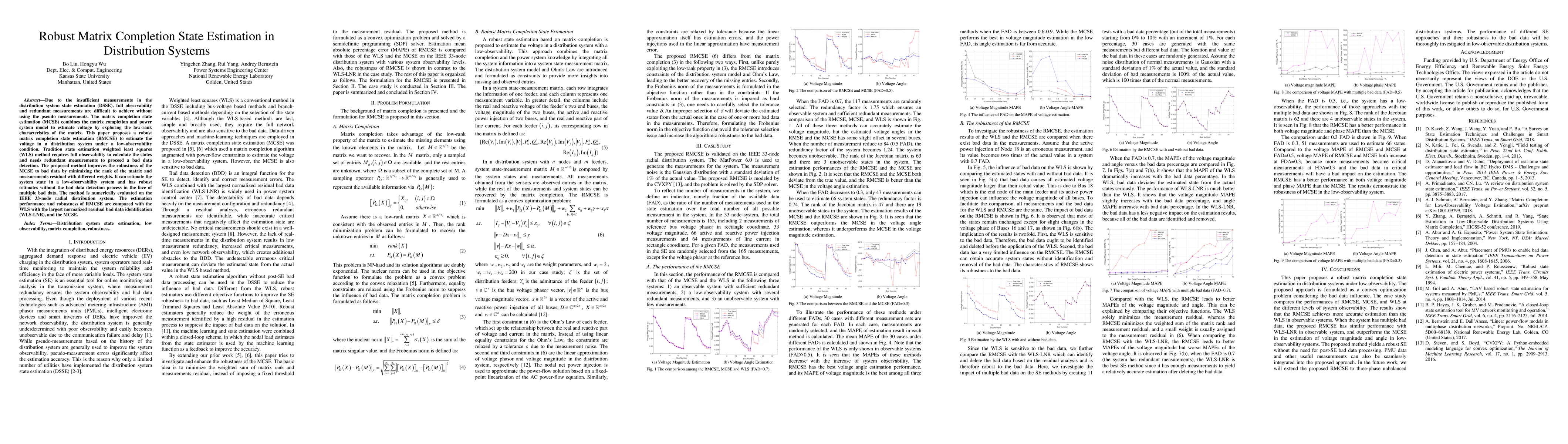 This paper proposes a robust matrix completion state estimation (RMCSE) method to estimate voltage in distribution systems under low-observability conditions, improving upon traditional weighted least squares (WLS) by minimizing matrix rank and measurement residuals. The RMCSE demonstrates enhanced robustness against bad data without requiring bad data detection.