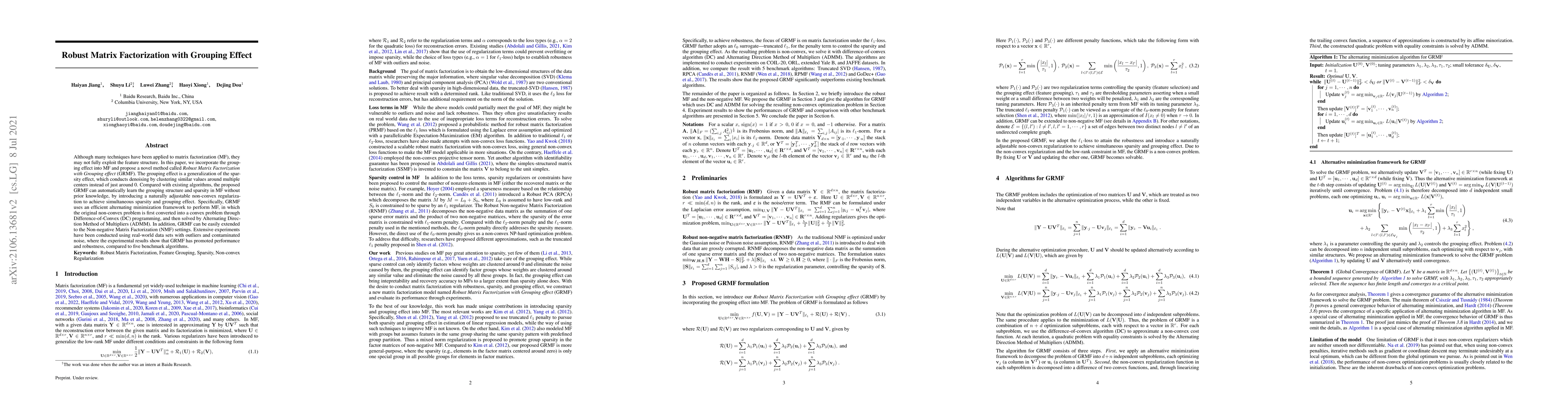 Although many techniques have been applied to matrix factorization (MF), they may not fully exploit the feature structure. In this paper, we incorporate the grouping effect into MF and propose a novel method called Robust Matrix Factorization with Grouping effect (GRMF). The grouping effect is a generalization of the sparsity effect, which conducts denoising by clustering similar values around multiple centers instead of just around 0. Compared with existing algorithms, the proposed GRMF can automatically learn the grouping structure and sparsity in MF without prior knowledge, by introducing a naturally adjustable non-convex regularization to achieve simultaneous sparsity and grouping effect. Specifically, GRMF uses an efficient alternating minimization framework to perform MF, in which the original non-convex problem is first converted into a convex problem through Difference-of-Convex (DC) programming, and then solved by Alternating Direction Method of Multipliers (ADMM). In addition, GRMF can be easily extended to the Non-negative Matrix Factorization (NMF) settings. Extensive experiments have been conducted using real-world data sets with outliers and contaminated noise, where the experimental results show that GRMF has promoted performance and robustness, compared to five benchmark algorithms.