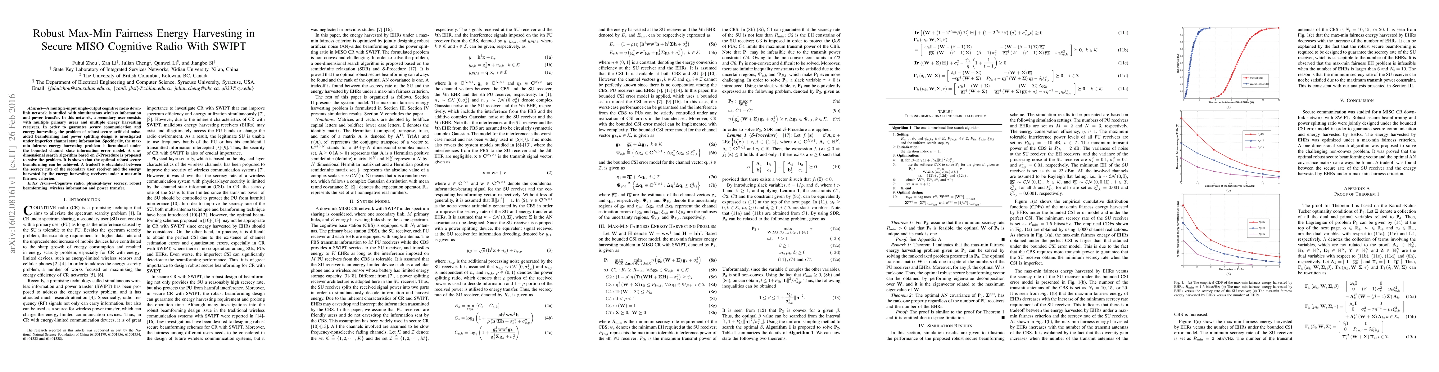 This paper investigates robust secure beamforming and power splitting in a MISO cognitive radio network with simultaneous wireless information and power transfer, focusing on max-min fairness for energy harvesting under imperfect channel state information. A one-dimensional search algorithm based on the ${\cal S}\text{-Procedure}$ is proposed to achieve optimal secure communication and energy harvesting, elucidating the tradeoff between the secrecy rate and energy harvested.