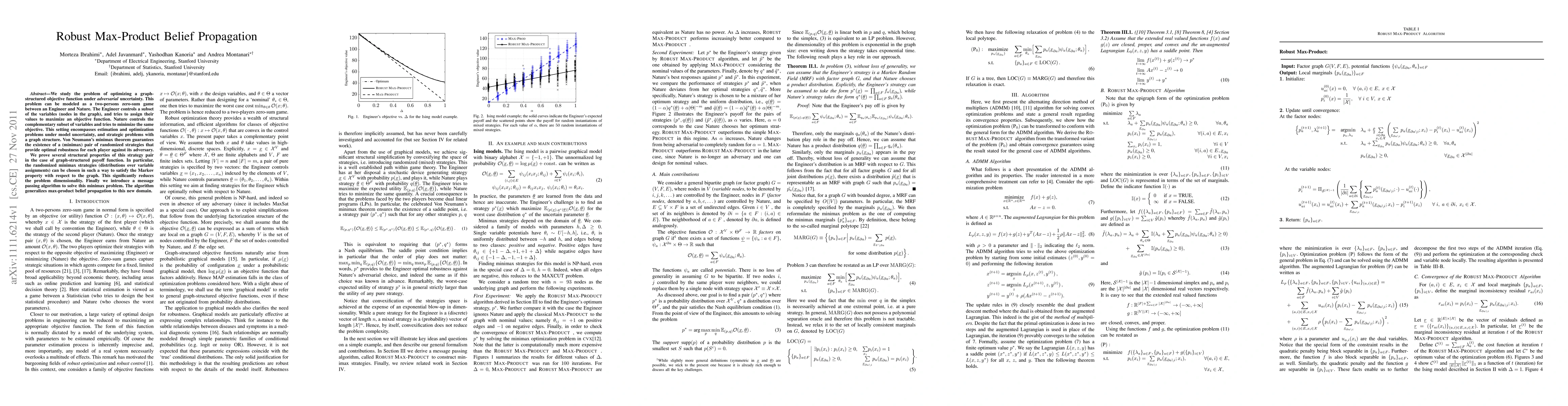 This paper explores optimizing graph-structured objective functions under adversarial uncertainty, modeling it as a two-person zero-sum game. It introduces a robust max-product belief propagation algorithm that leverages minimax strategies to handle model uncertainty, significantly reducing dimensionality through Markov property satisfaction.