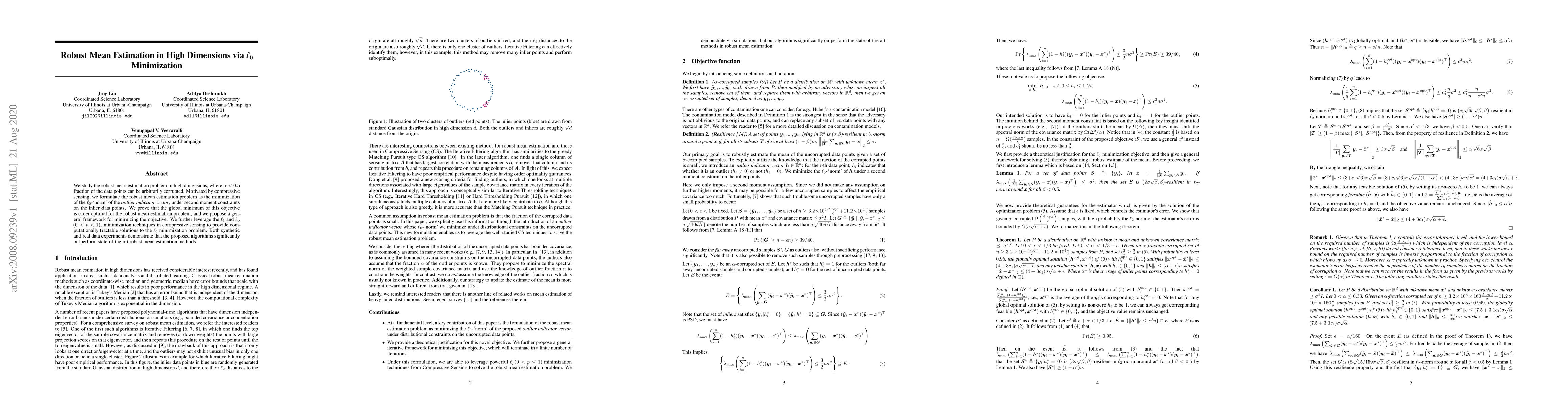 This paper proposes a robust mean estimation method in high dimensions using $\ell_0$ minimization, addressing scenarios where up to $\alpha < 0.5$ of the data can be corrupted. It leverages $\ell_1$ and $\ell_p$ minimization techniques for computational efficiency and demonstrates superior performance over existing methods through both synthetic and real data experiments.