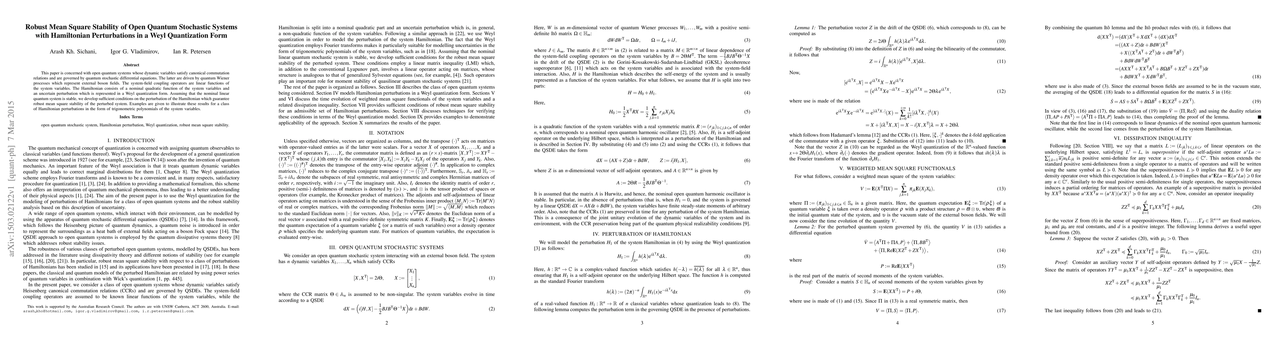 This paper investigates the robust mean square stability of open quantum stochastic systems under Hamiltonian perturbations in Weyl quantization form. It provides sufficient conditions for stability when the nominal linear quantum system is stable, illustrated with examples of trigonometric polynomial perturbations.
