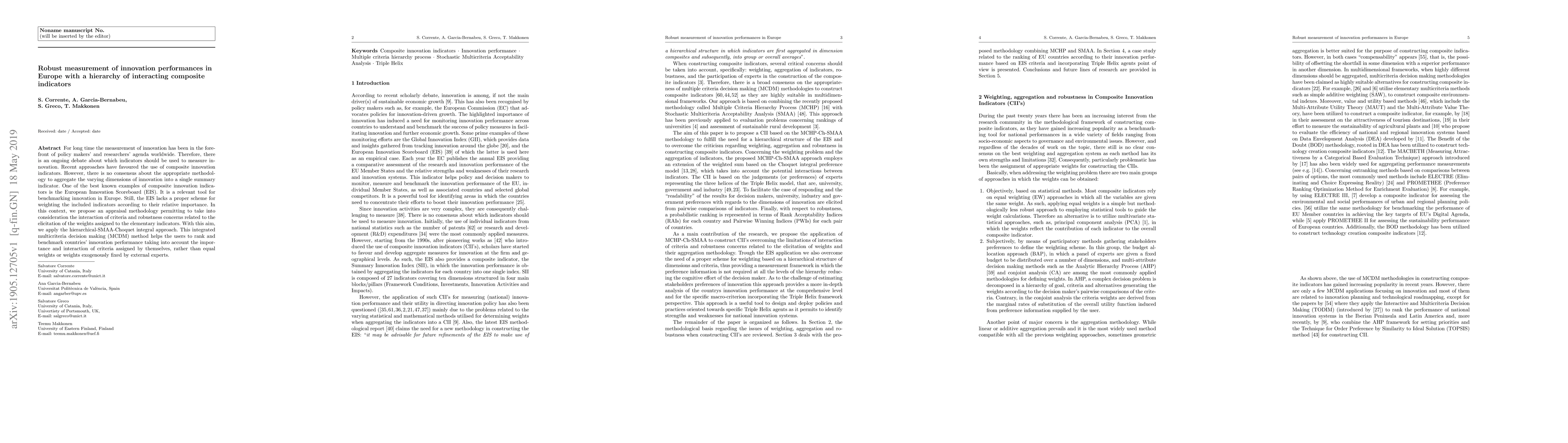 This paper proposes a robust methodology for measuring innovation performance in Europe using a hierarchy of interacting composite indicators. It introduces the hierarchical-SMAA-Choquet integral approach to aggregate various innovation dimensions, allowing for the consideration of criteria interactions and weight robustness, thus improving upon the European Innovation Scoreboard.