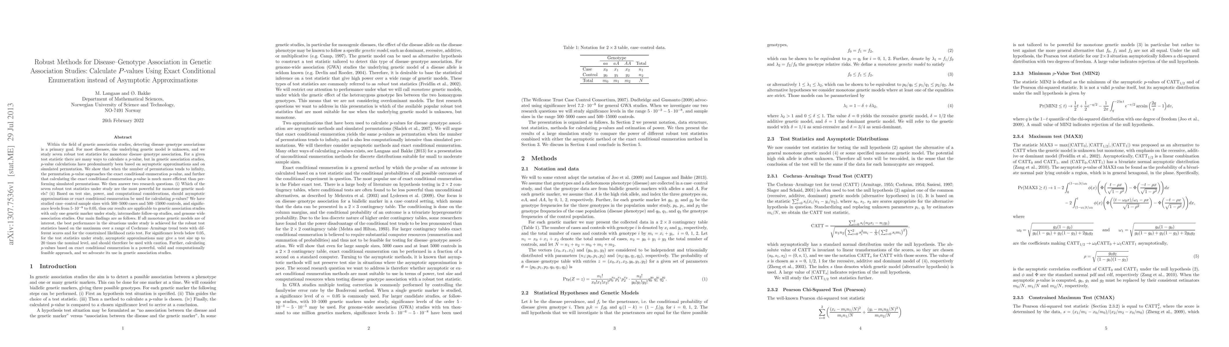 This paper evaluates seven robust test statistics for detecting disease-genotype associations in genetic studies, advocating for exact conditional enumeration over asymptotic approximations for calculating p-values due to its efficiency and validity. It concludes that exact methods are preferable for most scenarios, especially when considering significance levels below 0.05.