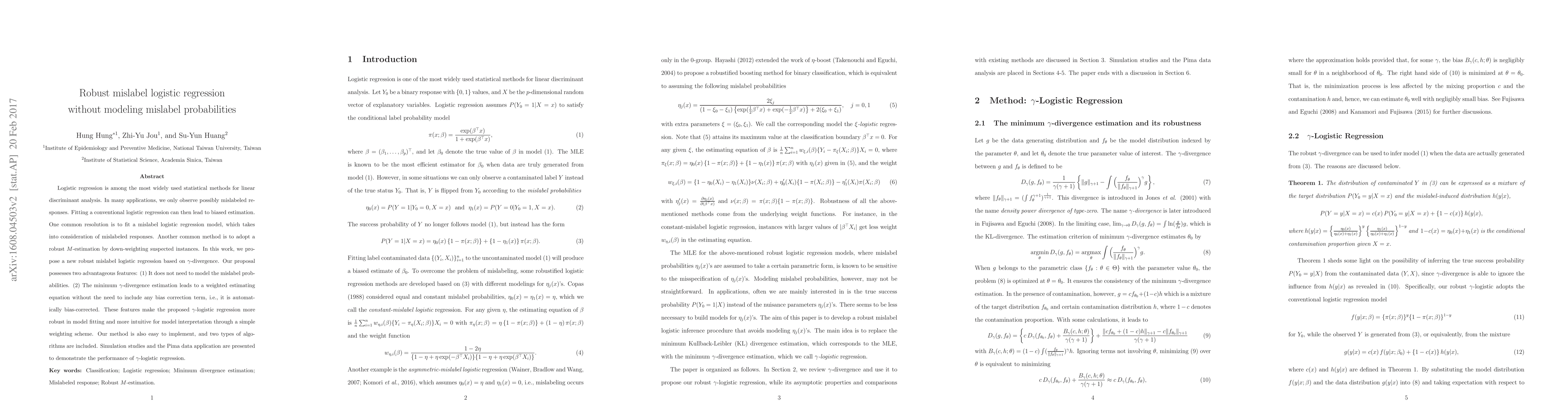 This paper proposes a robust mislabel logistic regression method based on gamma-divergence that does not require modeling mislabel probabilities. It offers automatic bias correction through a simple weighting scheme, making it both robust and intuitive for interpretation.
