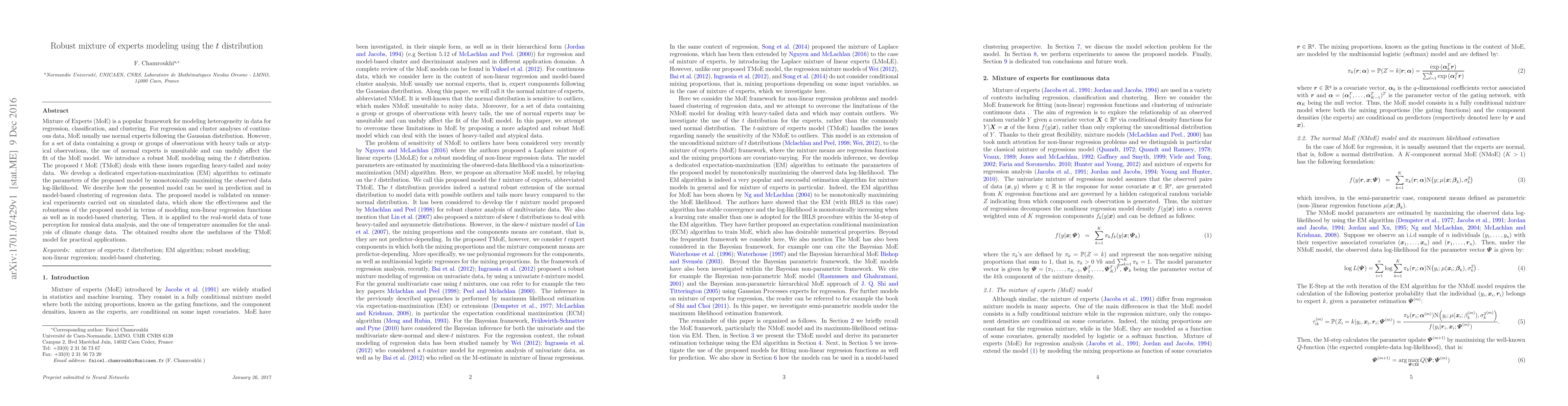 This paper proposes a robust Mixture of Experts (MoE) model using the $t$ distribution to handle heavy-tailed and noisy data, which is unsuitable for Gaussian-based MoE. The $t$ MoE (TMoE) is validated through simulations and real-world applications, demonstrating its effectiveness in regression and clustering tasks.