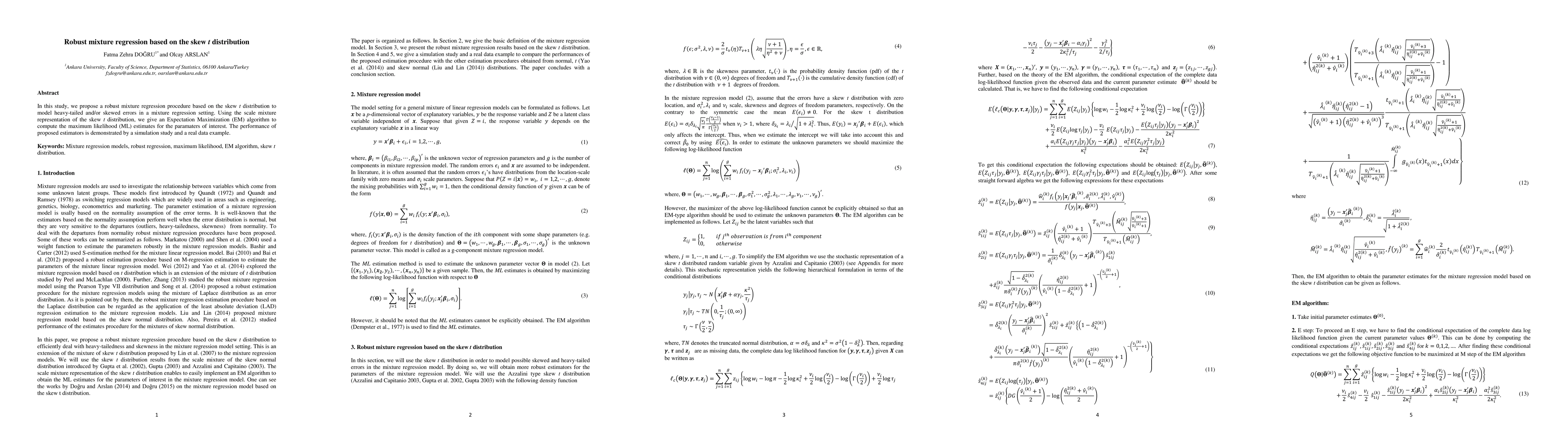 This paper introduces a robust mixture regression method based on the skew t distribution to handle heavy-tailed and skewed errors. An Expectation Maximization algorithm is developed to compute maximum likelihood estimates, and the method's effectiveness is validated through simulations and real data analysis.