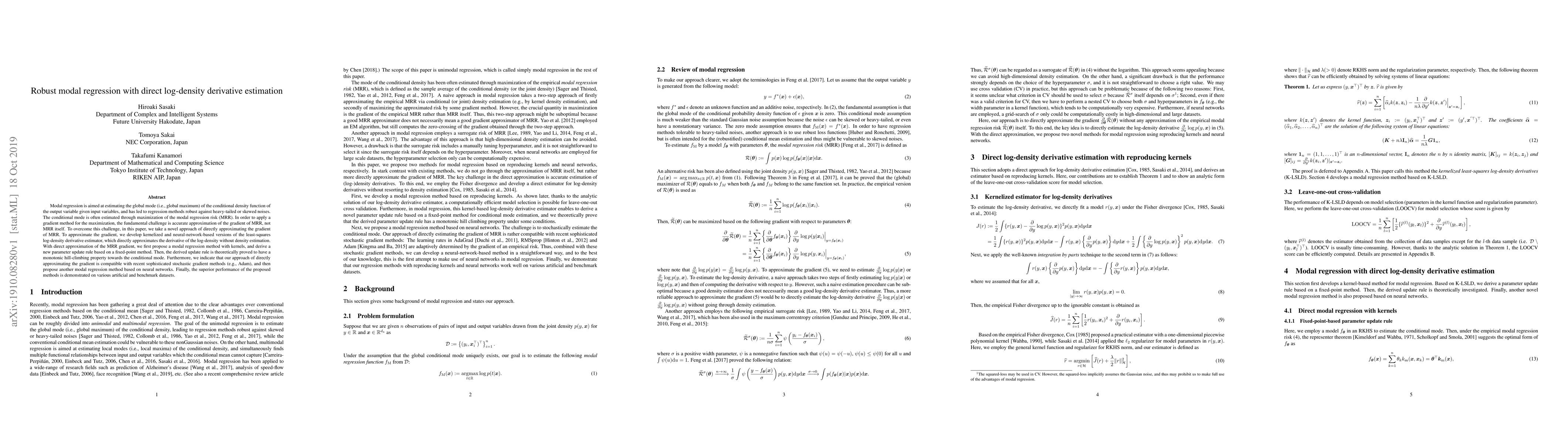 This paper proposes novel methods for robust modal regression by directly estimating the gradient of the modal regression risk (MRR) using kernelized and neural-network-based least-squares log-density derivative estimators. The methods demonstrate superior performance on various datasets, showing a monotonic hill-climbing property towards the conditional mode.