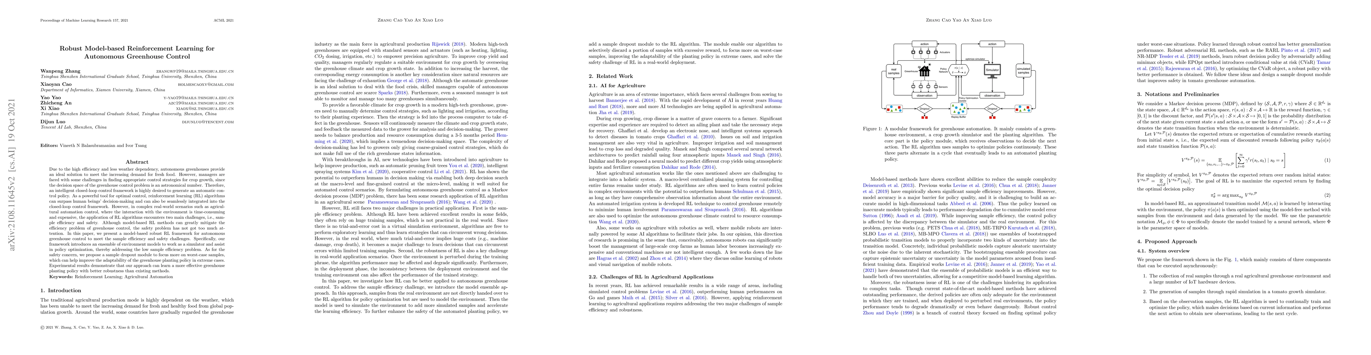Due to the high efficiency and less weather dependency, autonomous greenhouses provide an ideal solution to meet the increasing demand for fresh food. However, managers are faced with some challenges in finding appropriate control strategies for crop growth, since the decision space of the greenhouse control problem is an astronomical number. Therefore, an intelligent closed-loop control framework is highly desired to generate an automatic control policy. As a powerful tool for optimal control, reinforcement learning (RL) algorithms can surpass human beings' decision-making and can also be seamlessly integrated into the closed-loop control framework. However, in complex real-world scenarios such as agricultural automation control, where the interaction with the environment is time-consuming and expensive, the application of RL algorithms encounters two main challenges, i.e., sample efficiency and safety. Although model-based RL methods can greatly mitigate the efficiency problem of greenhouse control, the safety problem has not got too much attention. In this paper, we present a model-based robust RL framework for autonomous greenhouse control to meet the sample efficiency and safety challenges. Specifically, our framework introduces an ensemble of environment models to work as a simulator and assist in policy optimization, thereby addressing the low sample efficiency problem. As for the safety concern, we propose a sample dropout module to focus more on worst-case samples, which can help improve the adaptability of the greenhouse planting policy in extreme cases. Experimental results demonstrate that our approach can learn a more effective greenhouse planting policy with better robustness than existing methods.