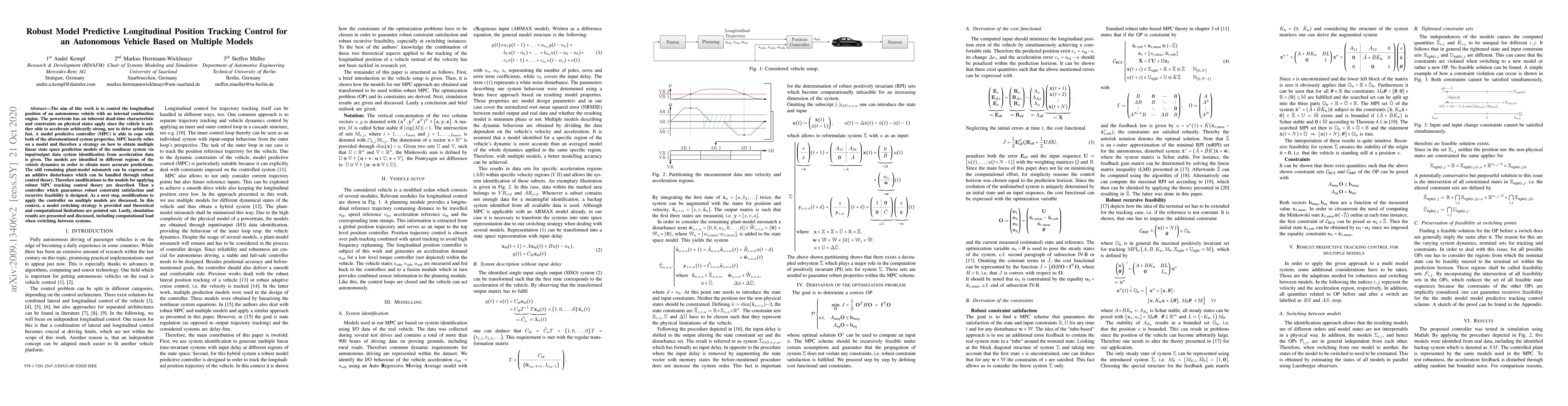 The aim of this work is to control the longitudinal position of an autonomous vehicle with an internal combustion engine. The powertrain has an inherent dead-time characteristic and constraints on physical states apply since the vehicle is neither able to accelerate arbitrarily strong, nor to drive arbitrarily fast. A model predictive controller (MPC) is able to cope with both of the aforementioned system properties. MPC heavily relies on a model and therefore a strategy on how to obtain multiple linear state space prediction models of the nonlinear system via input/output data system identification from acceleration data is given. The models are identified in different regions of the vehicle dynamics in order to obtain more accurate predictions. The still remaining plant-model mismatch can be expressed as an additive disturbance which can be handled through robust control theory. Therefore modifications to the models for applying robust MPC tracking control theory are described. Then a controller which guarantees robust constraint satisfaction and recursive feasibility is designed. As a next step, modifications to apply the controller on multiple models are discussed. In this context, a model switching strategy is provided and theoretical and computational limitations are pointed out. Lastly, simulation results are presented and discussed, including computational load when switching between systems.