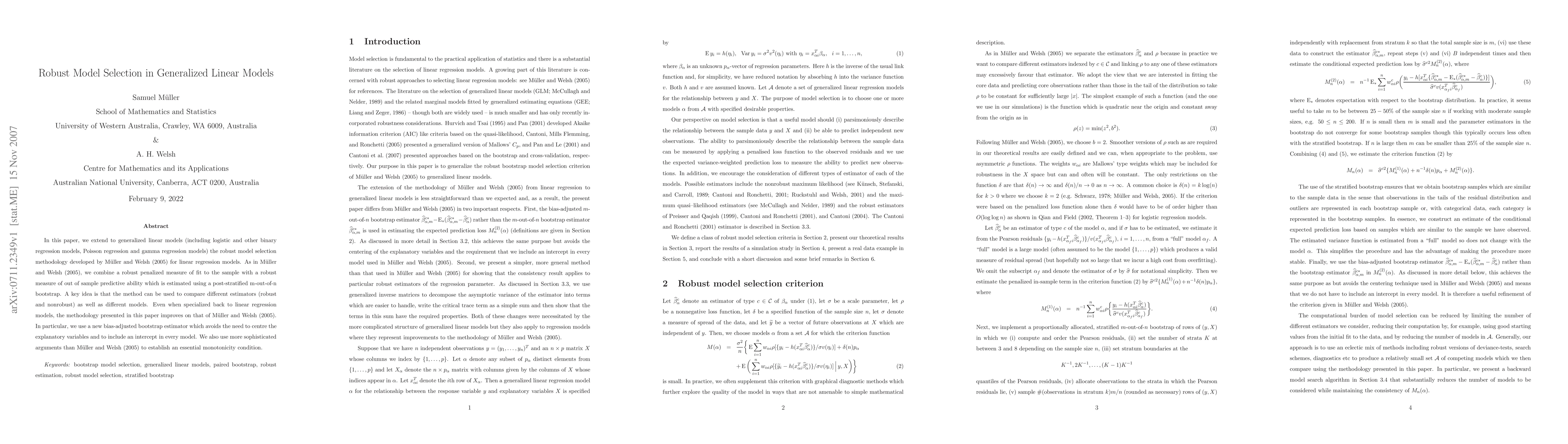 The paper extends robust model selection methodology from linear regression to generalized linear models, combining a robust penalized fit measure with a robust out-of-sample predictive ability estimate using a post-stratified bootstrap. It improves upon previous work by Mueller and Welsh (2005) through a new bias-adjusted bootstrap estimator, eliminating the need for centering explanatory variables and including an intercept in every model.