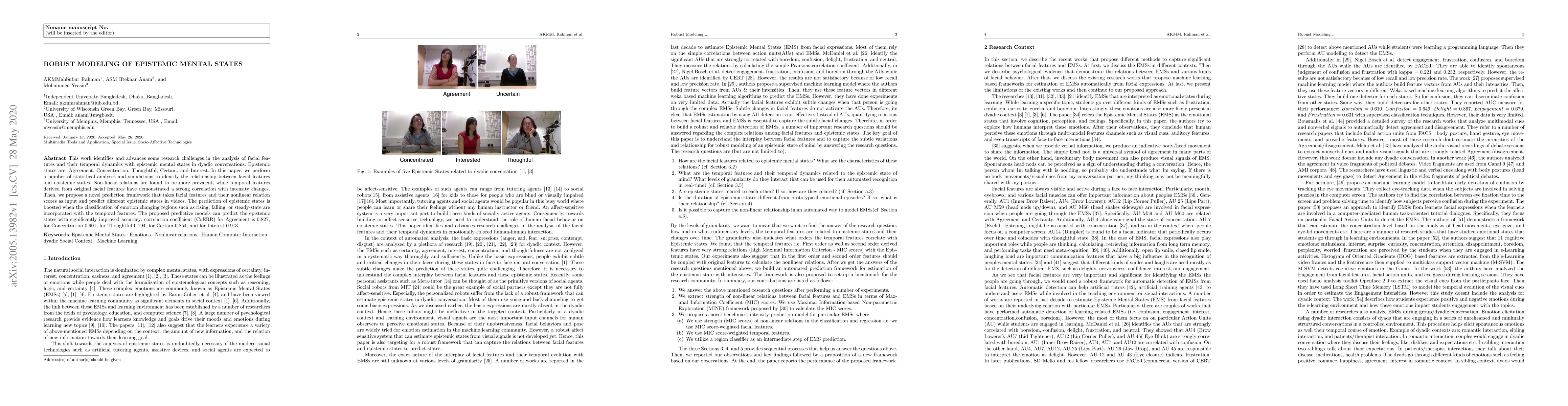 This work identifies and advances some research challenges in the analysis of facial features and their temporal dynamics with epistemic mental states in dyadic conversations. Epistemic states are: Agreement, Concentration, Thoughtful, Certain, and Interest. In this paper, we perform a number of statistical analyses and simulations to identify the relationship between facial features and epistemic states. Non-linear relations are found to be more prevalent, while temporal features derived from original facial features have demonstrated a strong correlation with intensity changes. Then, we propose a novel prediction framework that takes facial features and their nonlinear relation scores as input and predict different epistemic states in videos. The prediction of epistemic states is boosted when the classification of emotion changing regions such as rising, falling, or steady-state are incorporated with the temporal features. The proposed predictive models can predict the epistemic states with significantly improved accuracy: correlation coefficient (CoERR) for Agreement is 0.827, for Concentration 0.901, for Thoughtful 0.794, for Certain 0.854, and for Interest 0.913.