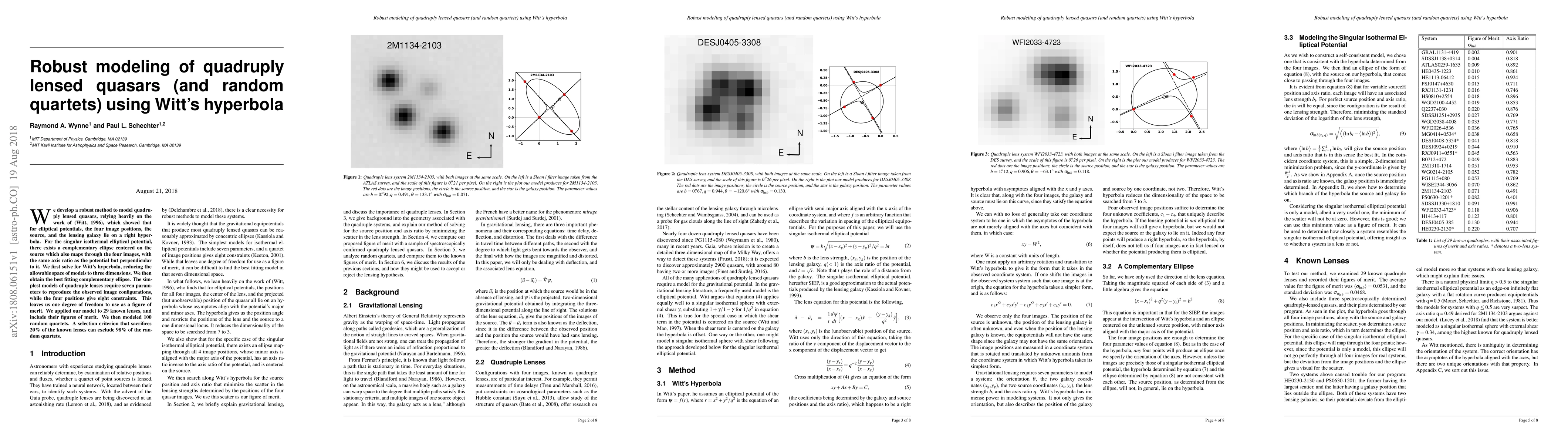 This paper develops a robust modeling technique for quadruply lensed quasars using Witt's hyperbola, reducing model complexity to three dimensions and fitting a complementary ellipse. The method was applied to 29 known lenses and 100 random quartets, showing a strong ability to distinguish true lenses from random configurations.
