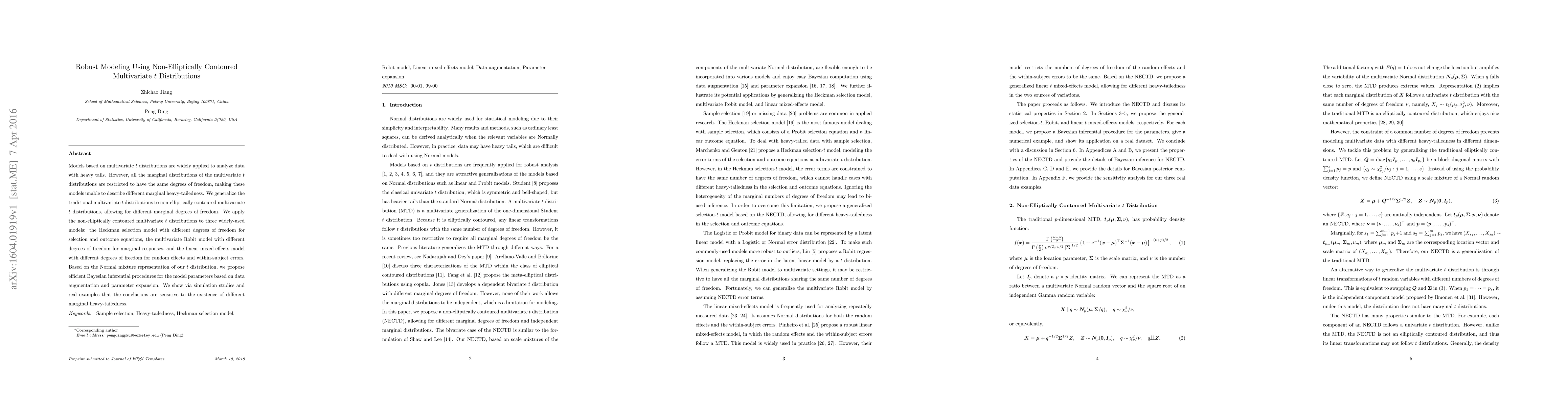 Models based on multivariate t distributions are widely applied to analyze data with heavy tails. However, all the marginal distributions of the multivariate t distributions are restricted to have the same degrees of freedom, making these models unable to describe different marginal heavy-tailedness. We generalize the traditional multivariate t distributions to non-elliptically contoured multivariate t distributions, allowing for different marginal degrees of freedom. We apply the non-elliptically contoured multivariate t distributions to three widely-used models: the Heckman selection model with different degrees of freedom for selection and outcome equations, the multivariate Robit model with different degrees of freedom for marginal responses, and the linear mixed-effects model with different degrees of freedom for random effects and within-subject errors. Based on the Normal mixture representation of our t distribution, we propose efficient Bayesian inferential procedures for the model parameters based on data augmentation and parameter expansion. We show via simulation studies and real examples that the conclusions are sensitive to the existence of different marginal heavy-tailedness.