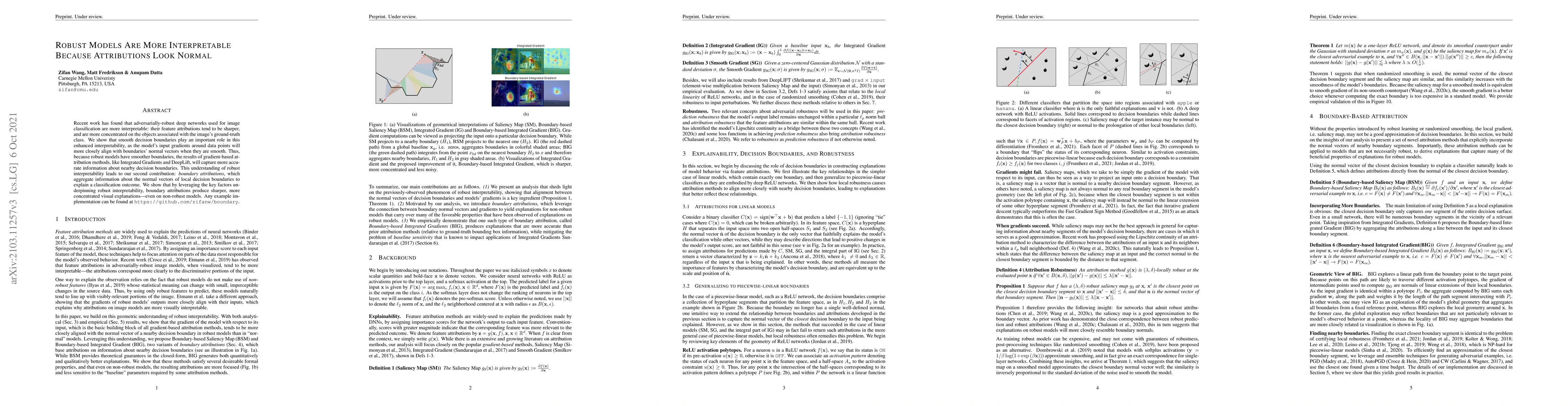 Recent work has found that adversarially-robust deep networks used for image classification are more interpretable: their feature attributions tend to be sharper, and are more concentrated on the objects associated with the image's ground-truth class. We show that smooth decision boundaries play an important role in this enhanced interpretability, as the model's input gradients around data points will more closely align with boundaries' normal vectors when they are smooth. Thus, because robust models have smoother boundaries, the results of gradient-based attribution methods, like Integrated Gradients and DeepLift, will capture more accurate information about nearby decision boundaries. This understanding of robust interpretability leads to our second contribution: \emph{boundary attributions}, which aggregate information about the normal vectors of local decision boundaries to explain a classification outcome. We show that by leveraging the key factors underpinning robust interpretability, boundary attributions produce sharper, more concentrated visual explanations -- even on non-robust models. Any example implementation can be found at \url{https://github.com/zifanw/boundary}.