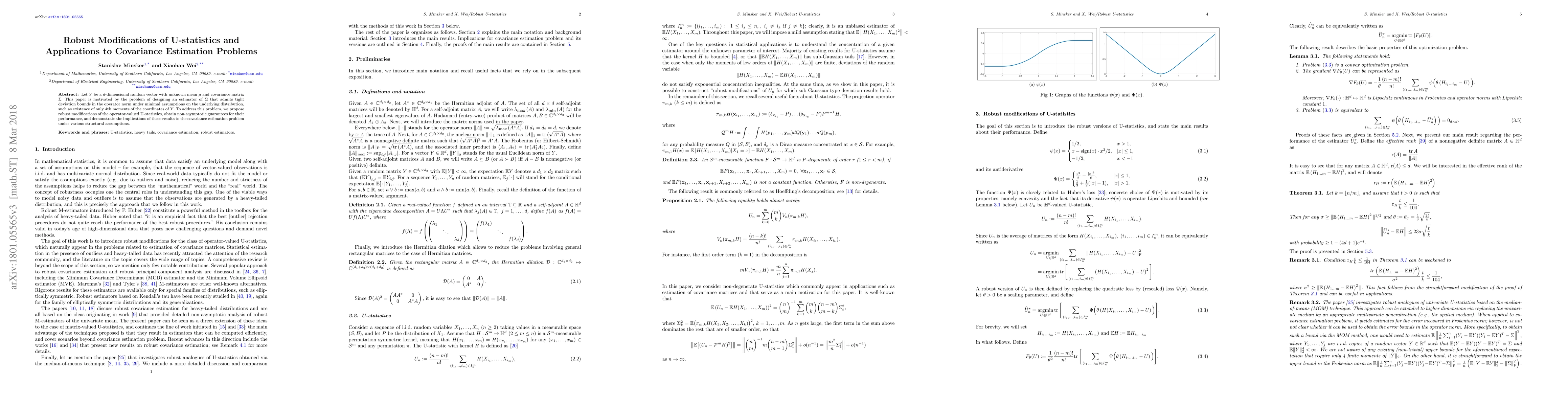 This paper proposes robust modifications to U-statistics for estimating covariance matrices with minimal assumptions on the underlying distribution. It provides non-asymptotic guarantees for the performance of these statistics under various structural assumptions.