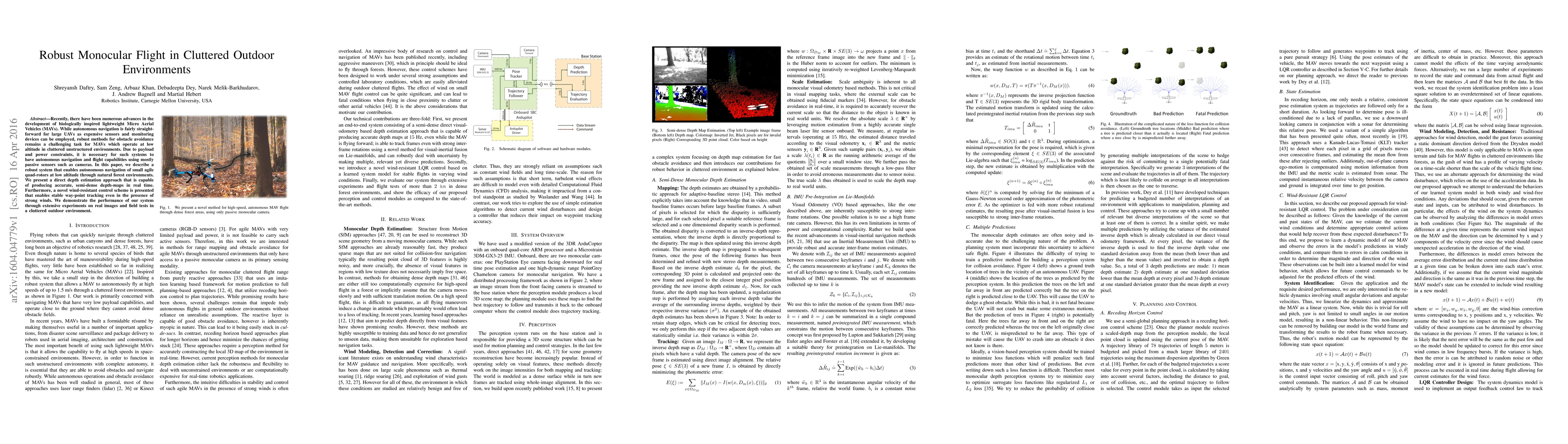 This paper presents a robust monocular navigation system for small quad-rotors operating in cluttered outdoor environments, utilizing real-time depth estimation and a wind-resistant control scheme for stable flight and obstacle avoidance. Experimental results show effective autonomous navigation in natural forest settings.