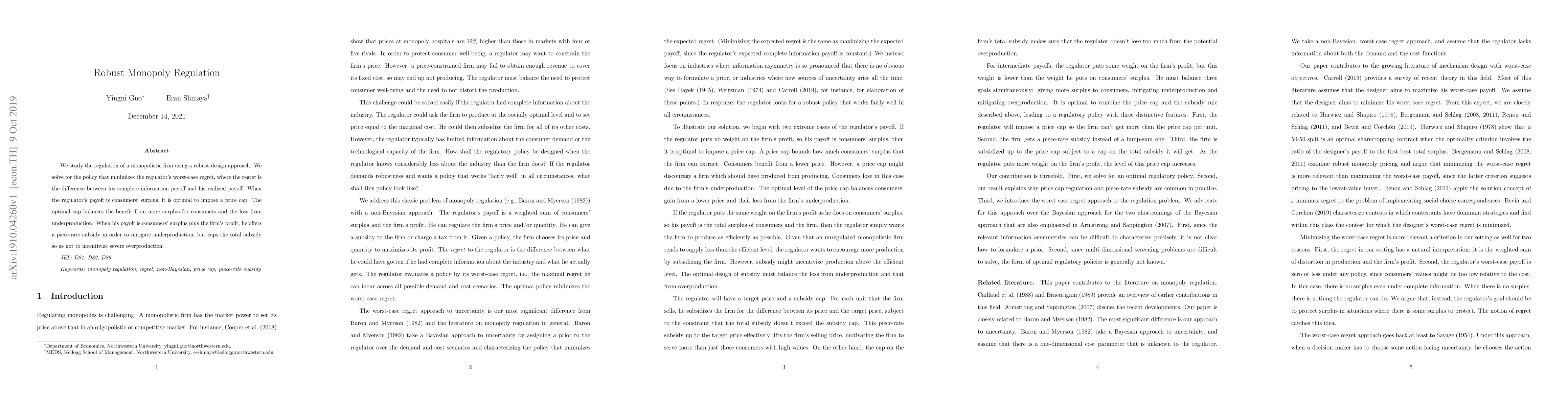 We study the regulation of a monopolistic firm using a robust-design approach. We solve for the policy that minimizes the regulator's worst-case regret, where the regret is the difference between his complete-information payoff minus his realized payoff. When the regulator's payoff is consumers' surplus, it is optimal to impose a price cap. The optimal cap balances the benefit from more surplus for consumers and the loss from underproduction. When his payoff is consumers' surplus plus the firm's profit, he offers a piece-rate subsidy in order to mitigate underproduction, but caps the total subsidy so as not to incentivize severe overproduction.