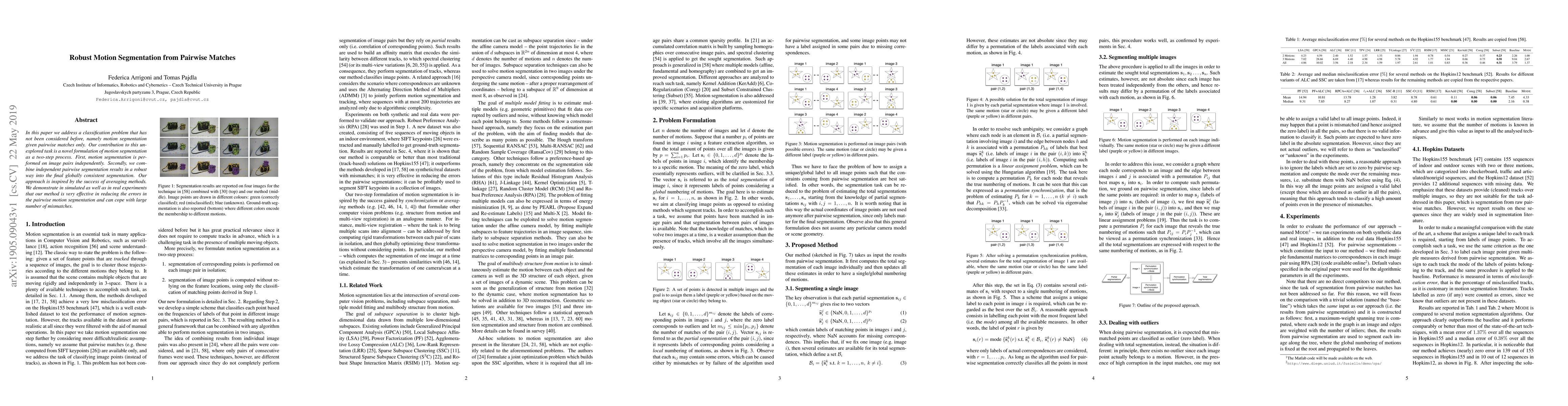 This paper introduces a novel two-step method for robust motion segmentation from pairwise matches, combining independent pairwise segmentations into a globally consistent result, demonstrating effectiveness in both simulated and real experiments. The method effectively reduces errors and handles a large number of mismatches.