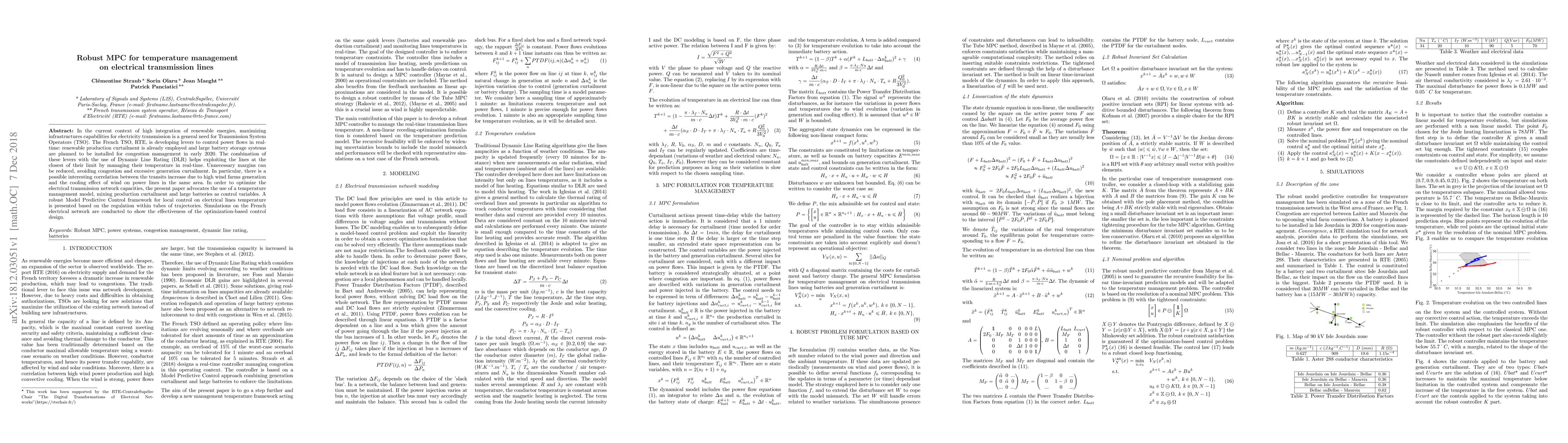 In the current context of high integration of renewable energies, maximizing infrastructures capabilities for electricity transmission is a general need for Transmission System Operators (TSO). The French TSO, RTE, is developing levers to control power flows in real-time: renewable production curtailment is already employed and large battery storage systems are planned to be installed for congestion management in early 2020. The combination of these levers with the use of Dynamic Line Rating (DLR) helps exploiting the lines at the closest of their limit by managing their temperature in real-time. Unnecessary margins can be reduced, avoiding congestion and excessive generation curtailment. In particular, there is a possible interesting correlation between the transits increase due to high wind farms generation and the cooling effect of wind on power lines in the same area. In order to optimize the electrical transmission network capacities, the present paper advocates the use of a temperature management model, mixing production curtailment and large batteries as control variables. A robust Model Predictive Control framework for local control on electrical lines temperature is presented based on the regulation within tubes of trajectories. Simulations on the French electrical network are conducted to show the effectiveness of the optimization-based control design.