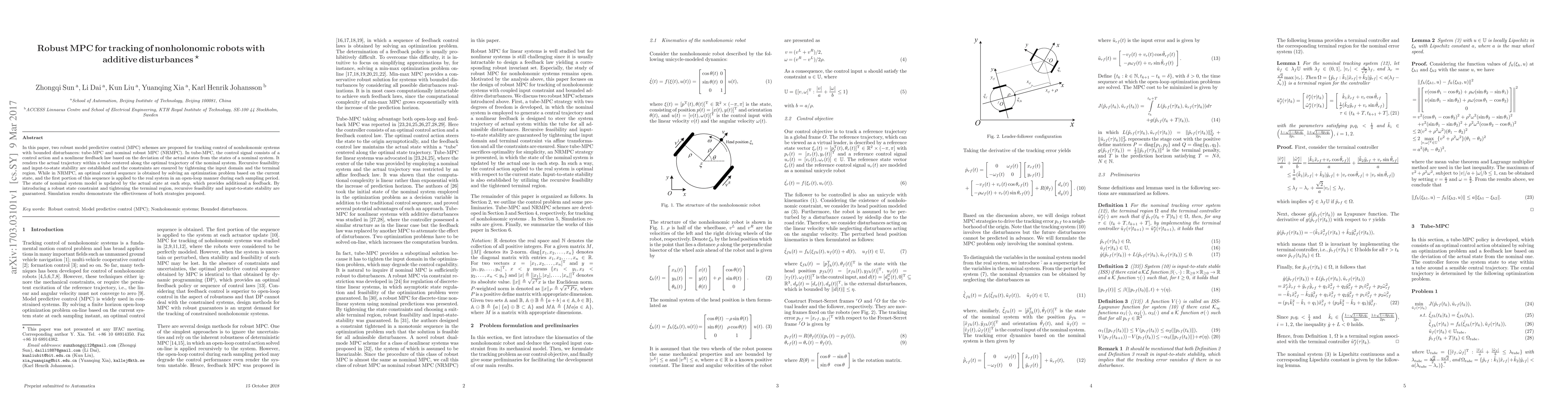 Researchers propose two robust model predictive control schemes for tracking nonholonomic robots with disturbances, ensuring recursive feasibility and input-to-state stability.