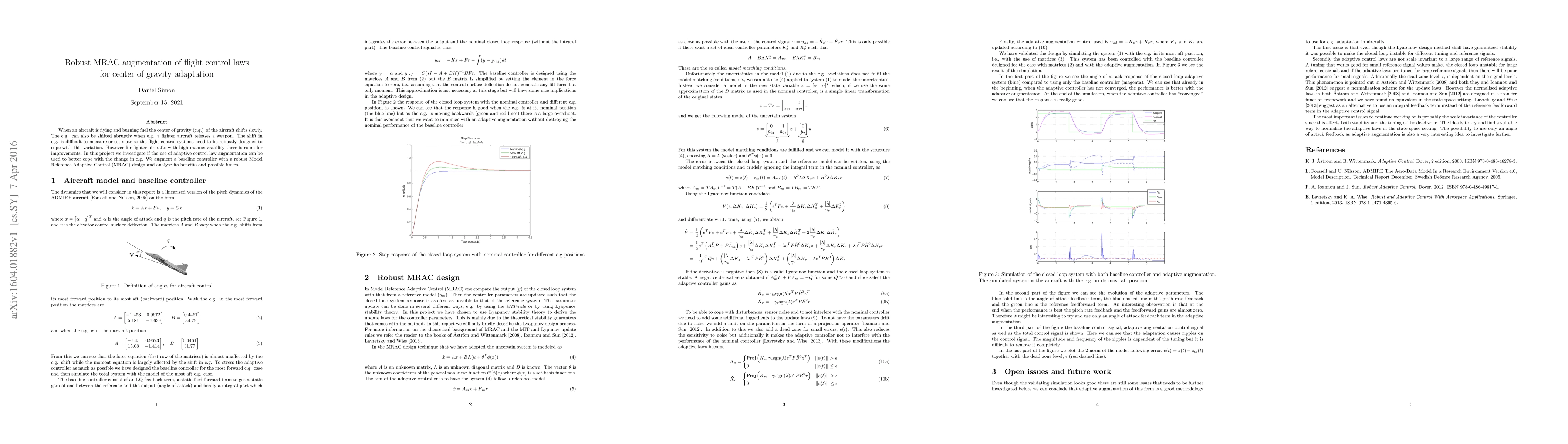 When an aircraft is flying and burning fuel the center of gravity (c.g.) of the aircraft shifts slowly. The c.g. can also be shifted abruptly when e.g. a fighter aircraft releases a weapon. The shift in c.g. is difficult to measure or estimate so the flight control systems need to be robustly designed to cope with this variation. However for fighter aircrafts with high manoeuvrability there is room for improvements. In this project we investigate if the use of adaptive control law augmentation can be used to better cope with the change in c.g. We augment a baseline controller with a robust Model Reference Adaptive Control (MRAC) design and analyse its benefits and possible issues.