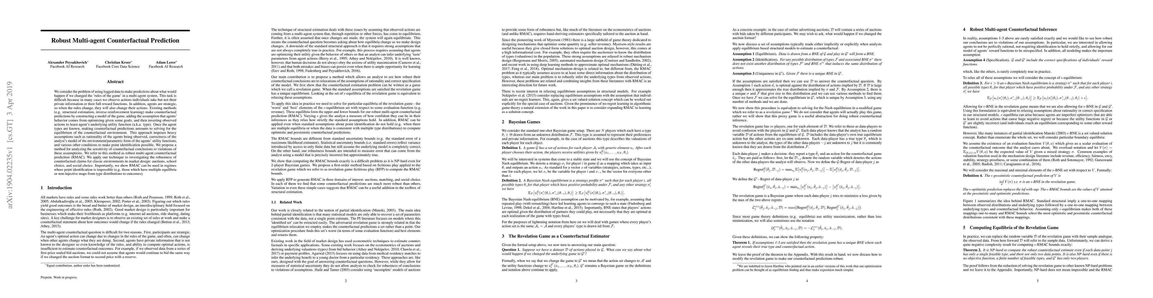 We consider the problem of using logged data to make predictions about what would happen if we changed the `rules of the game' in a multi-agent system. This task is difficult because in many cases we observe actions individuals take but not their private information or their full reward functions. In addition, agents are strategic, so when the rules change, they will also change their actions. Existing methods (e.g. structural estimation, inverse reinforcement learning) make counterfactual predictions by constructing a model of the game, adding the assumption that agents' behavior comes from optimizing given some goals, and then inverting observed actions to learn agent's underlying utility function (a.k.a. type). Once the agent types are known, making counterfactual predictions amounts to solving for the equilibrium of the counterfactual environment. This approach imposes heavy assumptions such as rationality of the agents being observed, correctness of the analyst's model of the environment/parametric form of the agents' utility functions, and various other conditions to make point identification possible. We propose a method for analyzing the sensitivity of counterfactual conclusions to violations of these assumptions. We refer to this method as robust multi-agent counterfactual prediction (RMAC). We apply our technique to investigating the robustness of counterfactual claims for classic environments in market design: auctions, school choice, and social choice. Importantly, we show RMAC can be used in regimes where point identification is impossible (e.g. those which have multiple equilibria or non-injective maps from type distributions to outcomes).