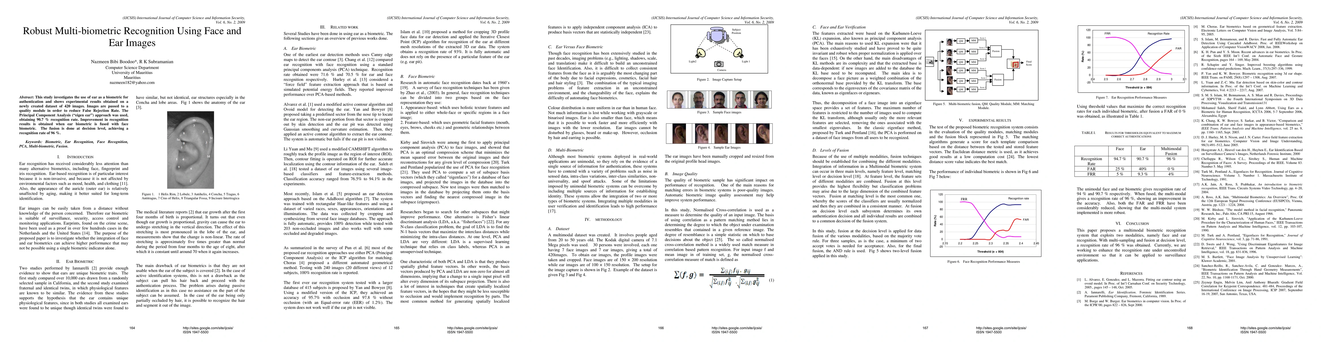 This study explores the use of ear biometrics for authentication, achieving a 90.7% recognition rate using Principal Component Analysis. Combining ear and face biometrics at the decision level further improves recognition to 96%.
