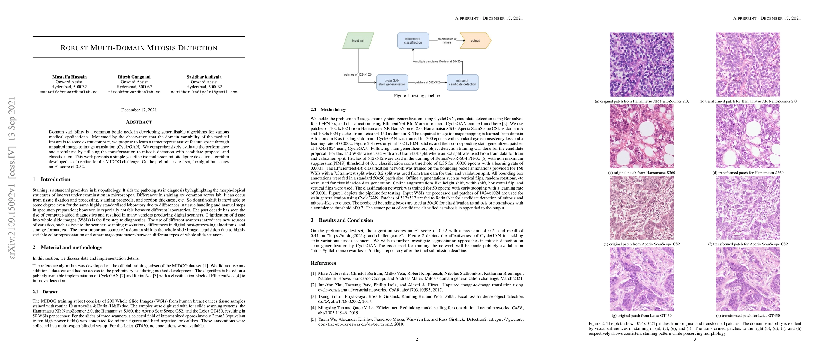 Researchers propose a new mitosis detection algorithm using CycleGAN to learn a target feature space, achieving an F1 score of 0.52 on a preliminary test set.