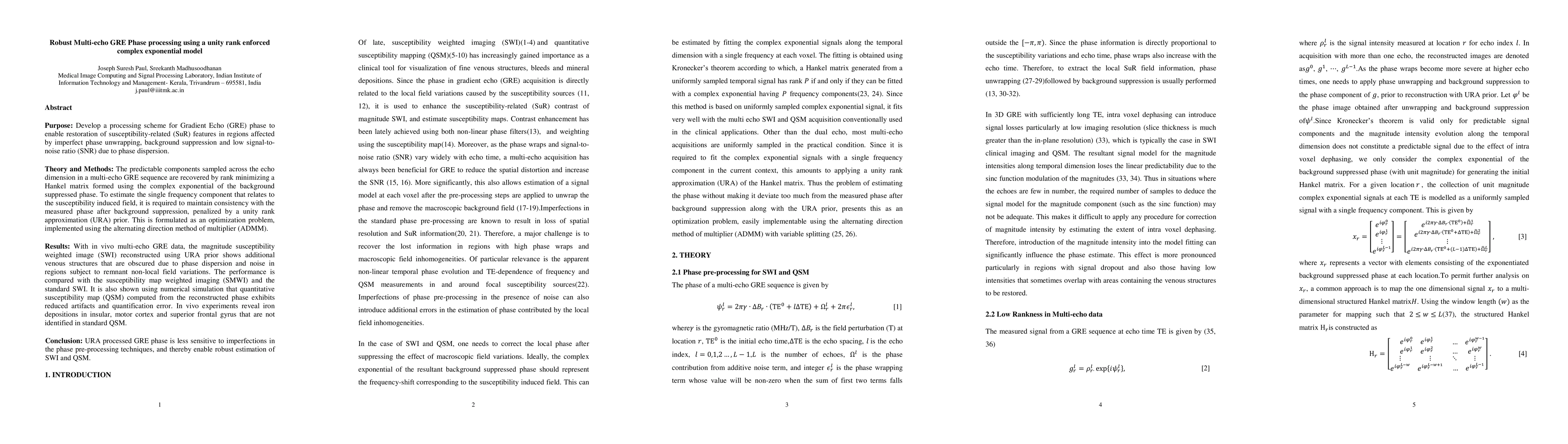 This paper develops a robust processing scheme for Gradient Echo (GRE) phase using a unity rank enforced complex exponential model to restore susceptibility-related features in MRI data, showing improved visualization of venous structures and iron deposits compared to standard methods. The method employs an optimization approach using the alternating direction method of multipliers (ADMM) to minimize rank and reduce artifacts in susceptibility weighted imaging and quantitative susceptibility mapping.