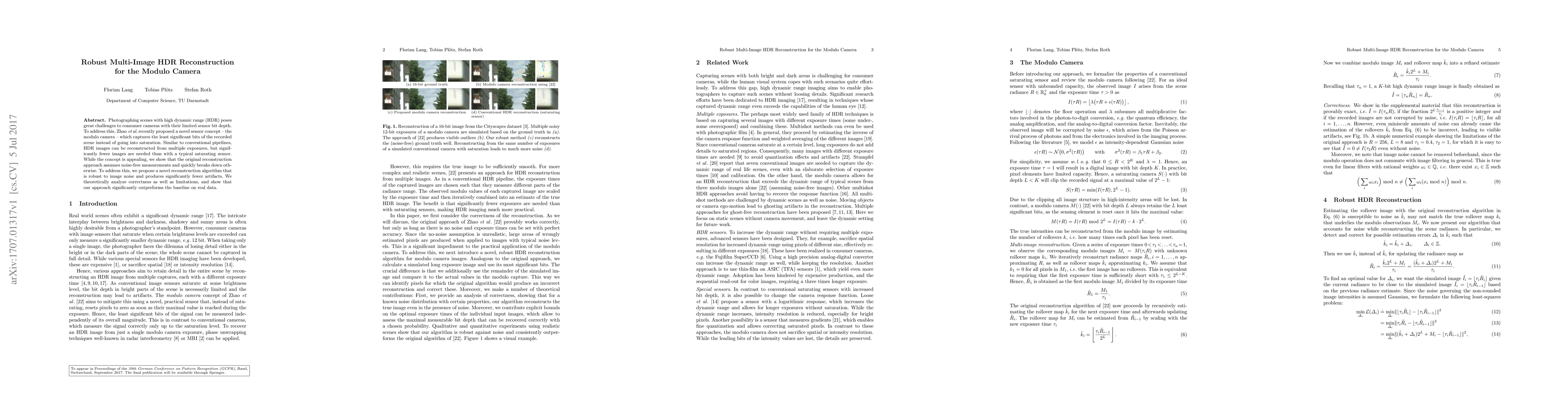 Photographing scenes with high dynamic range (HDR) poses great challenges to consumer cameras with their limited sensor bit depth. To address this, Zhao et al. recently proposed a novel sensor concept - the modulo camera - which captures the least significant bits of the recorded scene instead of going into saturation. Similar to conventional pipelines, HDR images can be reconstructed from multiple exposures, but significantly fewer images are needed than with a typical saturating sensor. While the concept is appealing, we show that the original reconstruction approach assumes noise-free measurements and quickly breaks down otherwise. To address this, we propose a novel reconstruction algorithm that is robust to image noise and produces significantly fewer artifacts. We theoretically analyze correctness as well as limitations, and show that our approach significantly outperforms the baseline on real data.